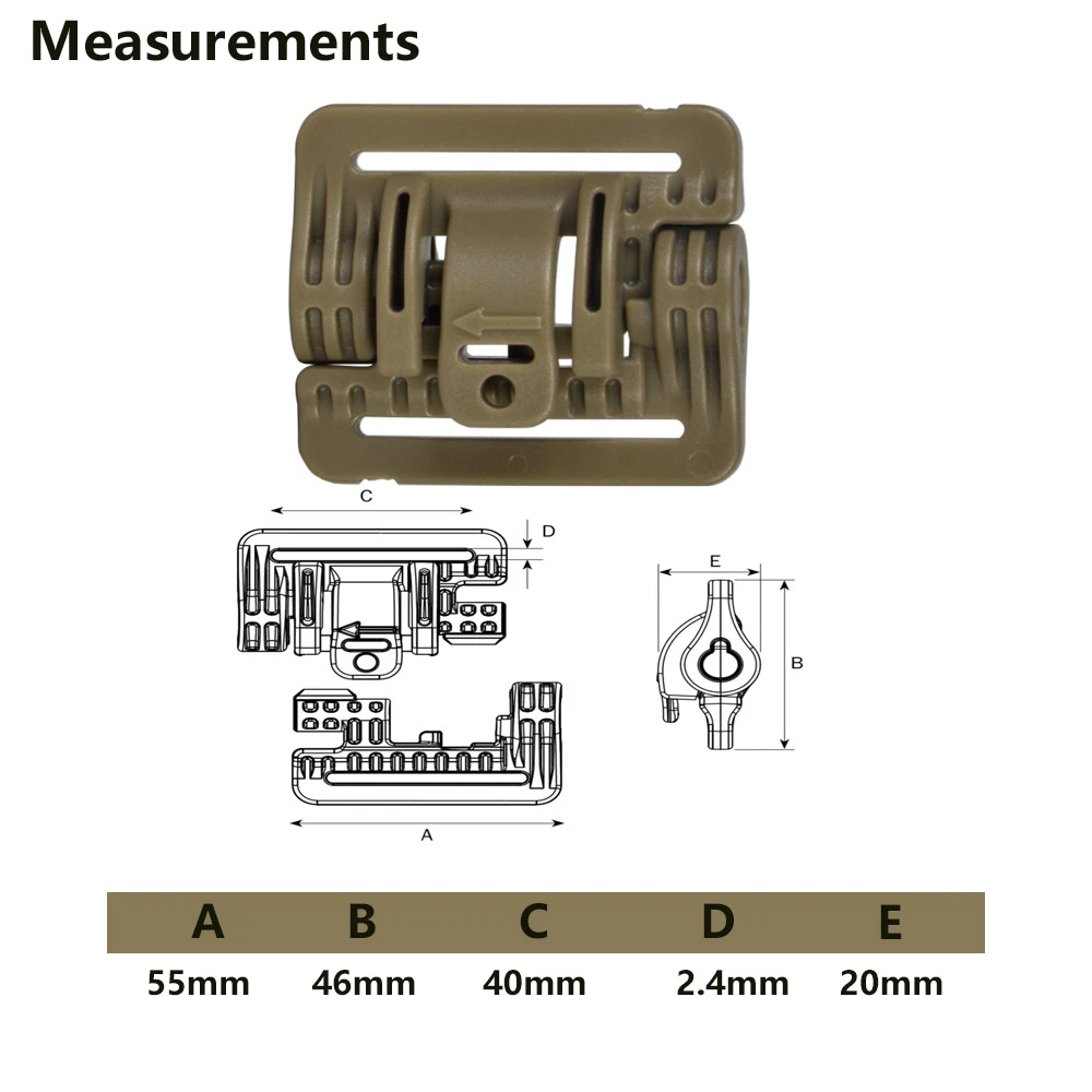 ROC de dos piezas (conector de apertura rápida) Se utiliza en armaduras de carrocería militares y tácticas, soportes de placas, chalecos, etc. Las ranuras admiten correas de 40 mm.