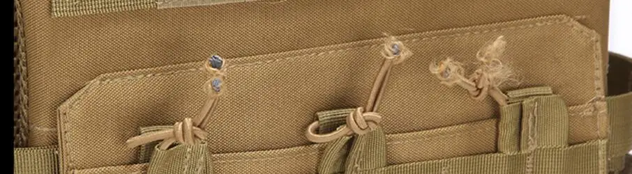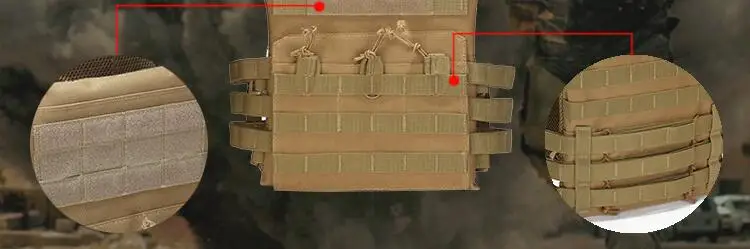 1: Diseño de cinturón molle delantero y trasero:Es conveniente equiparse con varias bolsas de accesorios.Diseño de correa adhesiva molle en el pecho, se puede pegar con adhesivo y otros equipos.