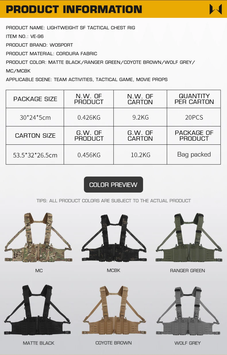 Cordura, aparejo de pecho ligero SF, colgador de pecho de liberación rápida para exteriores con sistema MOLLE, accesorios de caza Información del producto: Nombre del producto: Equipo de pecho ligero SFCintura ajustada: 80-110 cmEscena aplicable: equipos al aire libre, accesorios de películas. Material del producto: Corduratela Color del producto: Negro/Verde Ranger/Gris Lobo/Marrón Coyote/MC/MCBK