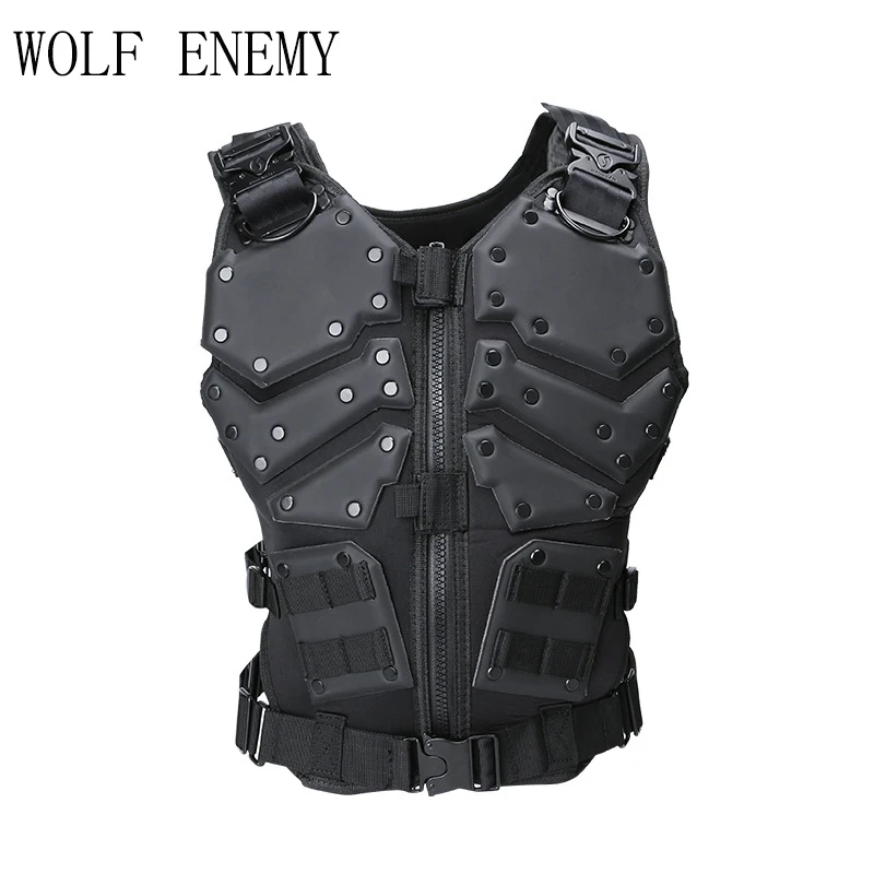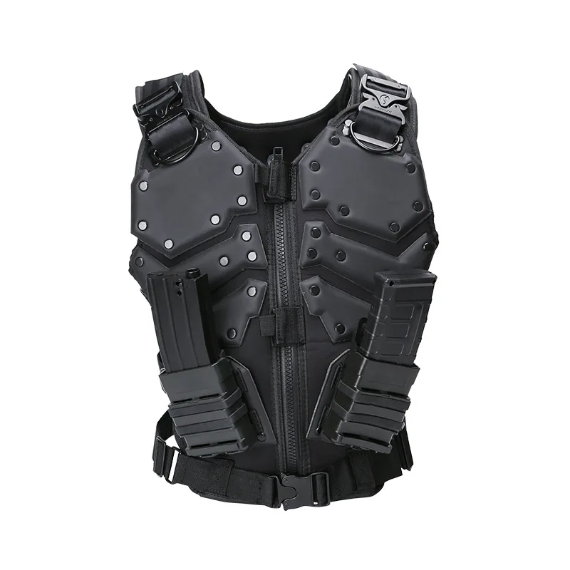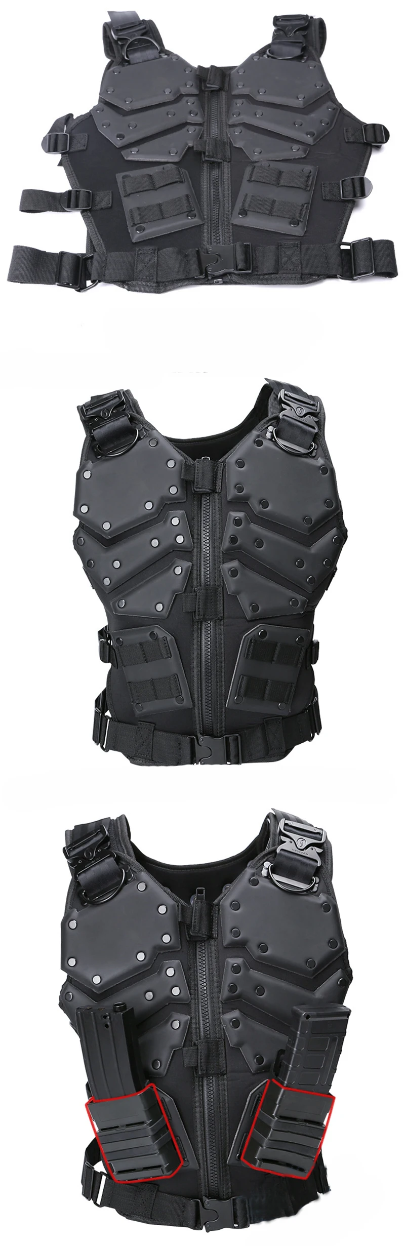 Perfecto para bolsas FastMag. (bolsas no incluidas) los remaches de botón fuertes aseguran placas para chaleco de plataforma. Tres correas ajustables a cada lado para un ajuste perfecto. Las hebillas Cobra sujetan las correas de los hombros de forma segura. Hombros ajustables mediante superposición de velcro y correas de nailon. Es la plataforma perfecta para una carga ligera. Esta armadura corporal futurista se ve extremadamente agresiva cuando se combina con los accesorios adecuados. Las correas MOLLE proporcionan suficiente espacio para bolsillos sin sobrecargarlo, lo que hace que este chaleco sea ideal para operadores de alta velocidad. Las placas de armadura de neopreno duro proporcionan una protección cómoda sin pesarte. Combina el chaleco con un cinturón táctico y tienes la carga máxima de alta velocidad, juegos de campo y cualquier cosa en el medio.