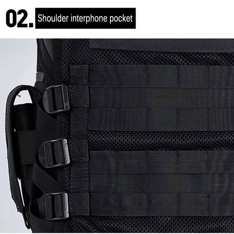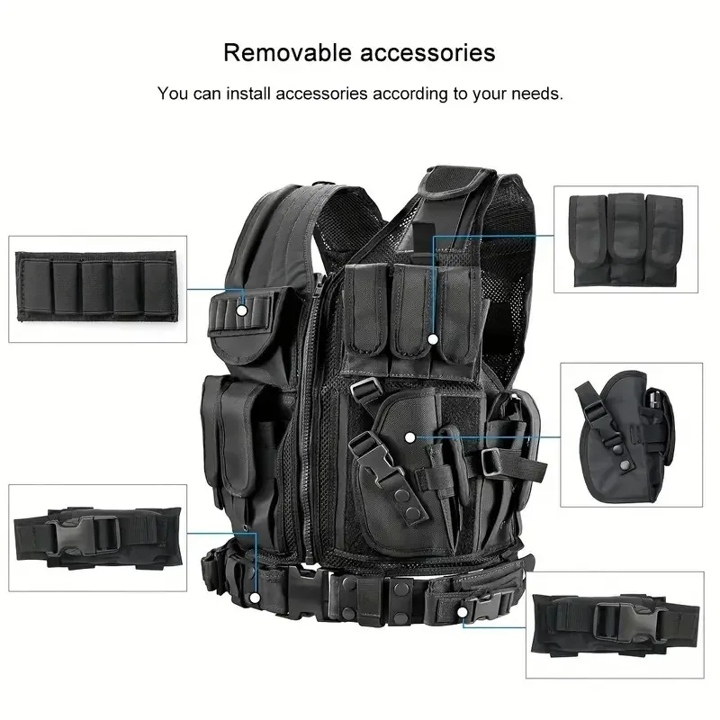 Nuestro chaleco tiene 3 bolsas para cargadores de rifle, 3 bolsas para equipos pequeños, 1 funda para pistola, 1 bolsa para linterna, 1 bolsa entre teléfono, 1 bolsa para accesorios, 1 soporte para balas extraíble, 1 bolsa para teléfono, 1 bolsillo interior de malla para bolsa de hidratación y 2 documentos internos. bolsas.