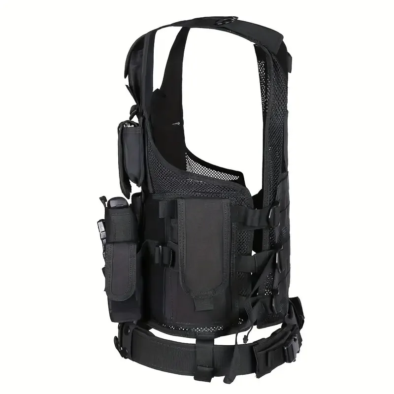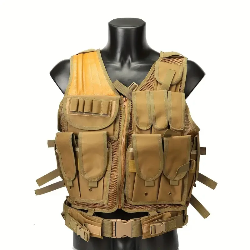 Hecho de poliéster 600D de alta densidad, cómodo y duradero, cremalleras grandes y resistentes y malla.El chaleco táctico es resistente e ideal para juegos de CS, airsoft, paintball, combates y batallas.