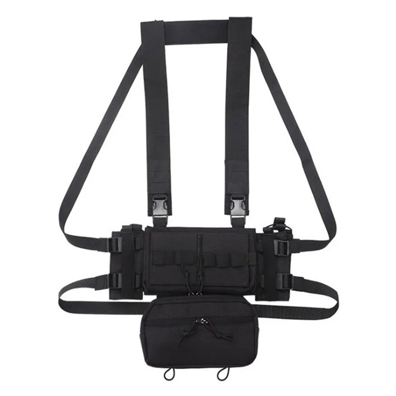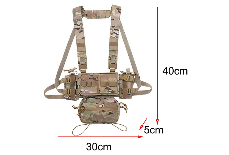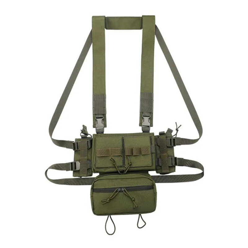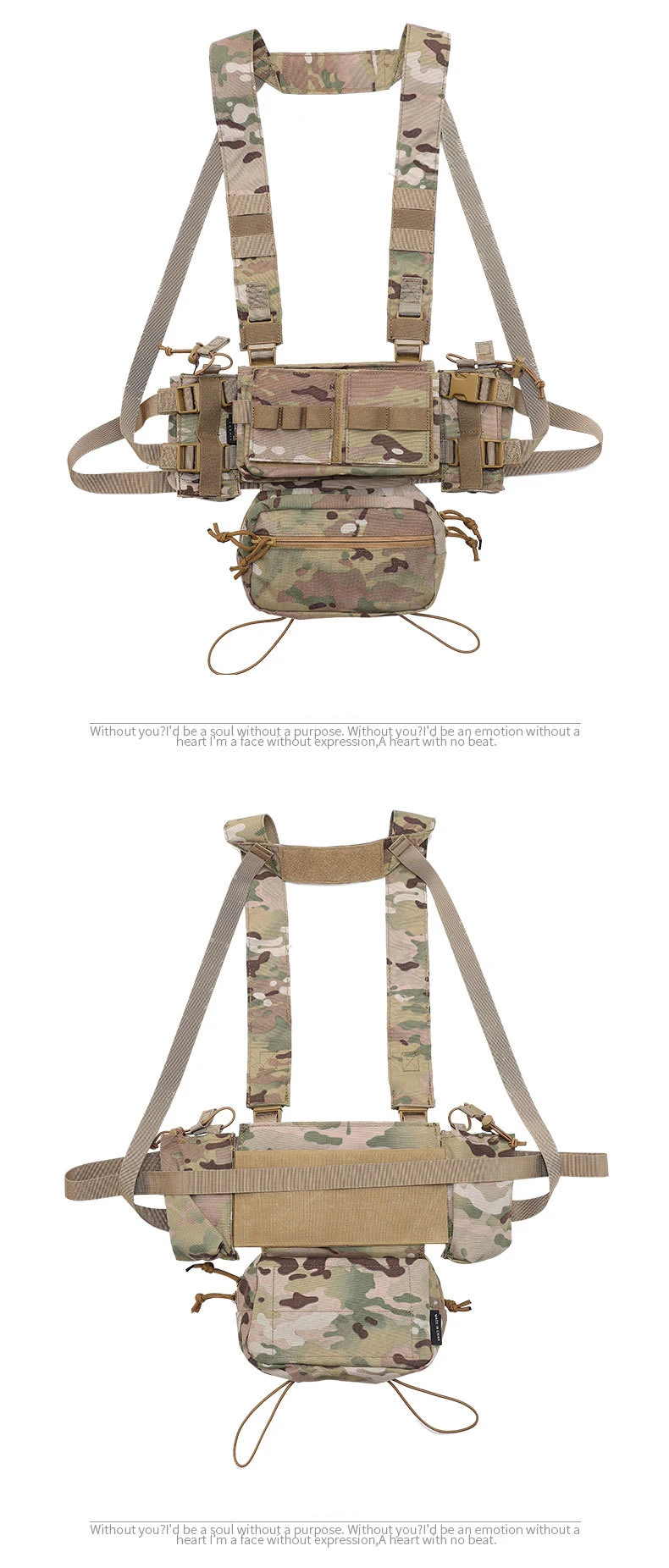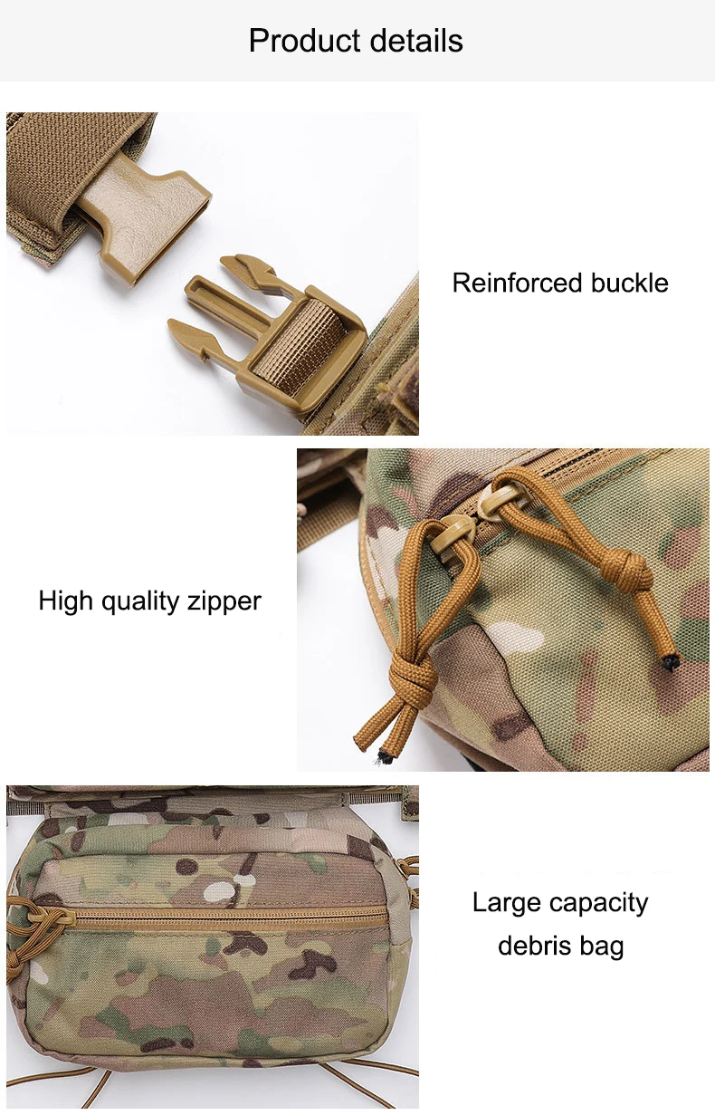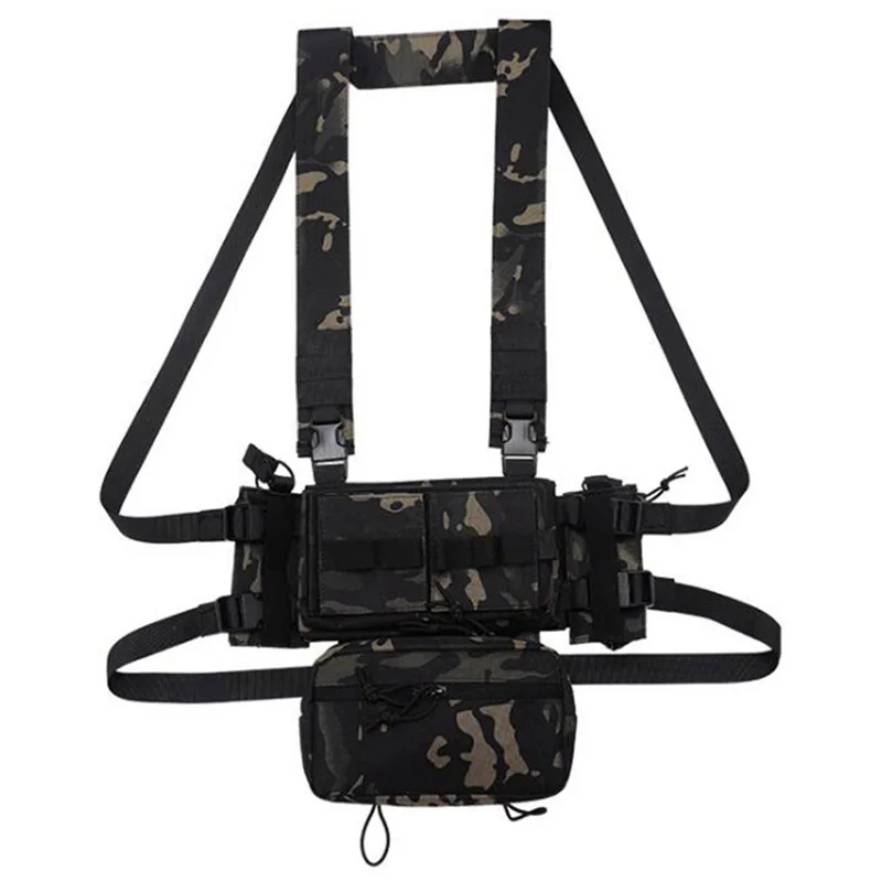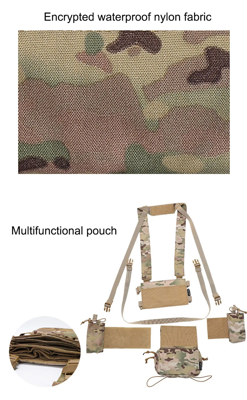 1. Fabricado con material de nailon 2. Características de la tela de repelente al agua y resistencia a la abrasión, ideal para todas las actividades al aire libre 3. Compartimentos múltiples y desmontables: Cada Parte del aparejo del pecho se puede ajustar y reemplazar con el mismo tipo de accesorios, lo que mejora enormemente la compatibilidad. 4. Ajustable para adaptarse a todos los jugadores de diferentes tamaños 5. Diseño ligero para liberar la presión 6. Con una bolsa funcional para llevar artículos pequeños. 7. Con 3 bolsas 556 MAG, 3 bolsas 762 MAG, 2 bolsas grandes 762 Mag 8.Ideal para actividades de aventura al aire libre, airsoft y actividades de caza
