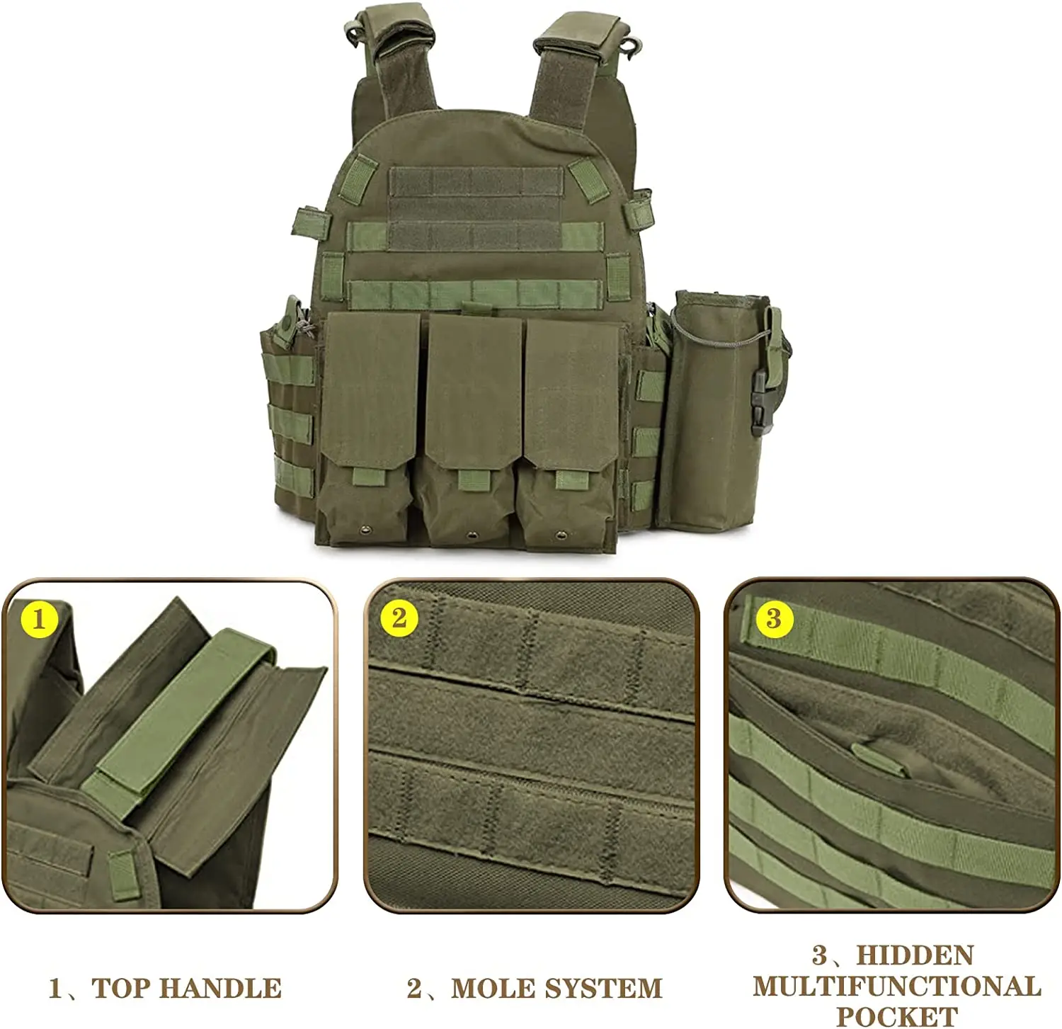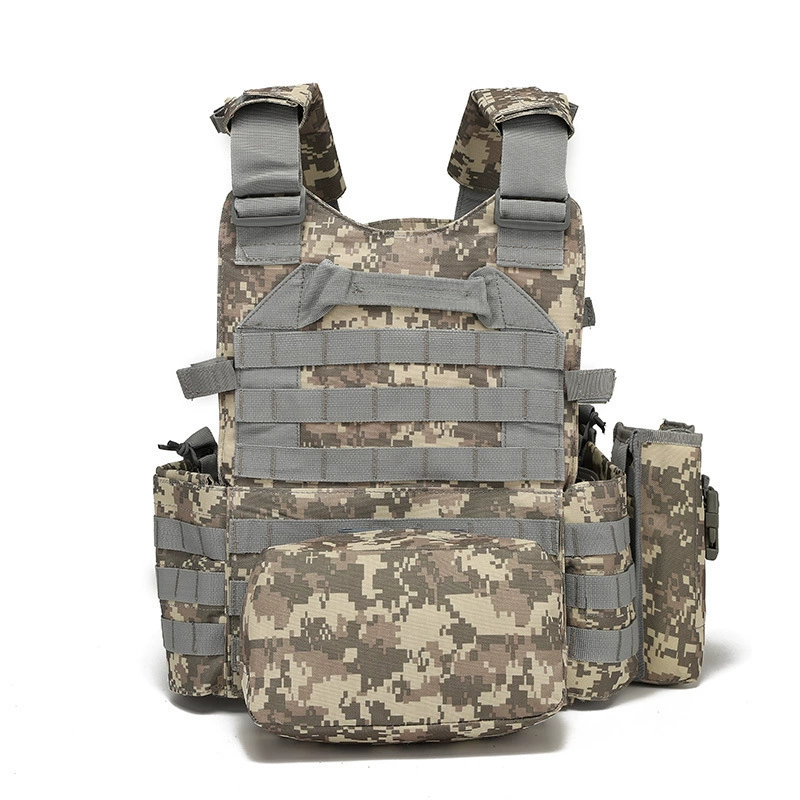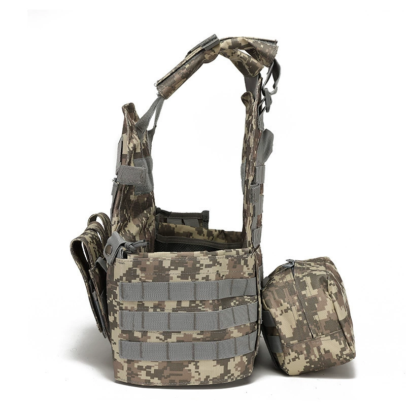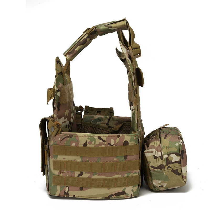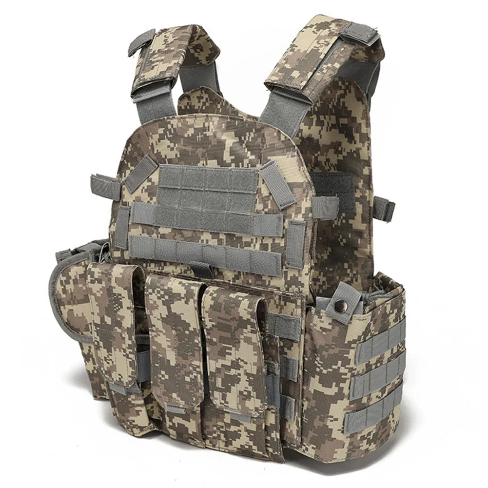 Chaleco de nailon de camuflaje para caza, chaleco portador de placa, armadura corporal, chaleco Molle multifuncional, ajustable para hombres y mujeres, equipo Airsoft para Camping, viajes, deporte, ciclismo al aire libre Característica: 1. Nailon impermeable de alta resistencia y densidad: adopta material de nailon impermeable densificado de alta resistencia, gran funcionalidad, resistencia a los arañazos y durabilidad 2. Diseño de sellado de la cintura: Diseño de sellado de la cintura. El exterior del sellado de la cintura se puede agregar con una bolsa y proporciona ventilación, que cambia el chaleco de caza tradicional pesado y congestionado. 3. Hebilla de liberación rápida: el sistema de gancho rápido de hebilla de metal en la parte posterior del paquete es fácil de desmontar cuando no es necesario. 4. Hombro y cintura ajustables: el chaleco de caza es ajustable. Molle en ambos lados es conveniente para sujetar múltiples bolsas u otros artículos, y también se pueden adjuntar insignias, lo cual es muy práctico y conveniente. 5. Ampliamente utilizado: Es un accesorio imprescindible adecuado para el entrenamiento de caza, camping, deportes al aire libre. Especificación: Origen: China continental Género: HOMBRE Temporada: primavera, verano, otoño, invierno Material: nailon Tejido: tela de nailon encriptado 600D Tamaño: 55cm/21 pulgadas de alto y 45cm/17,7 pulgadas de ancho Longitud del hombro ajustable La longitud de la cintura se puede ajustar a 120cm/47 pulgadas Color: marrón, negro, verde, CP, ACU