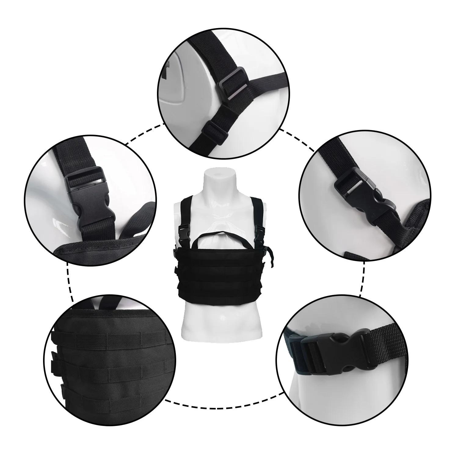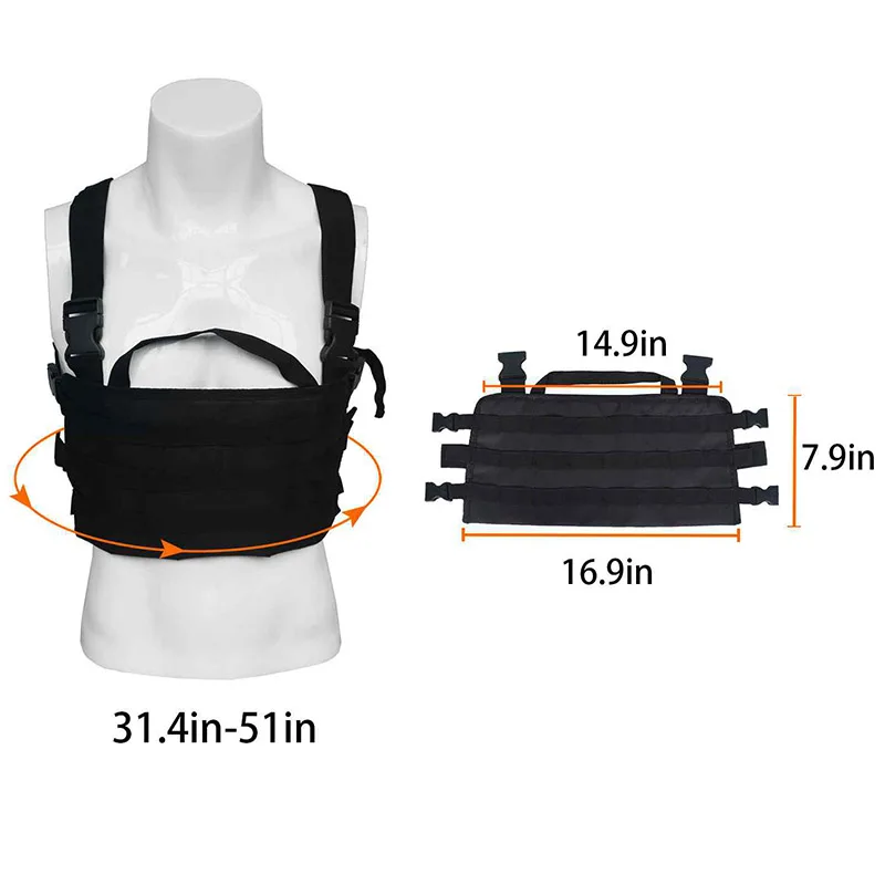 Arnés trasero ajustable para adaptarse a diferentes tamaños de operadores. Construido de 500 denier rip stop o nylon CORDURA División frontal fácil capacidad de encendido/apagado. Correas de hombro acolchadas ajustables. Compatible con plataformas de pistolera y correas MOLLE. El paquete incluye: 1 * chaleco molle paddle de pecho
