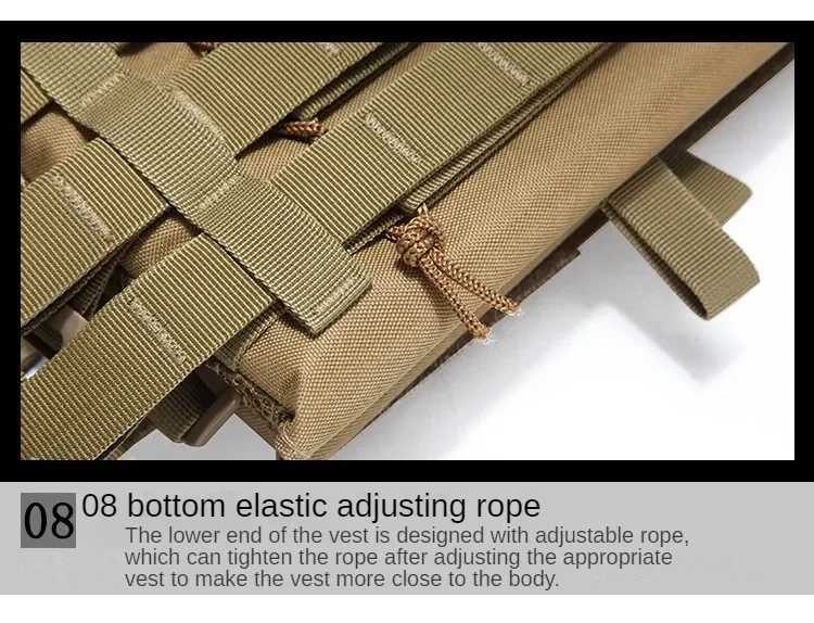 2: Diseño de correa molle delantera y trasera:Es conveniente estar equipado con varias bolsas de accesorios. Pegatina con diseño de correa molle en el pecho, se puede pegar con pegatina y otros equipos.