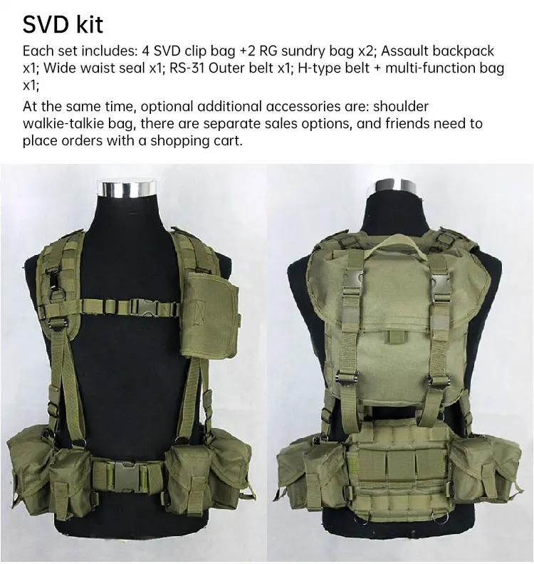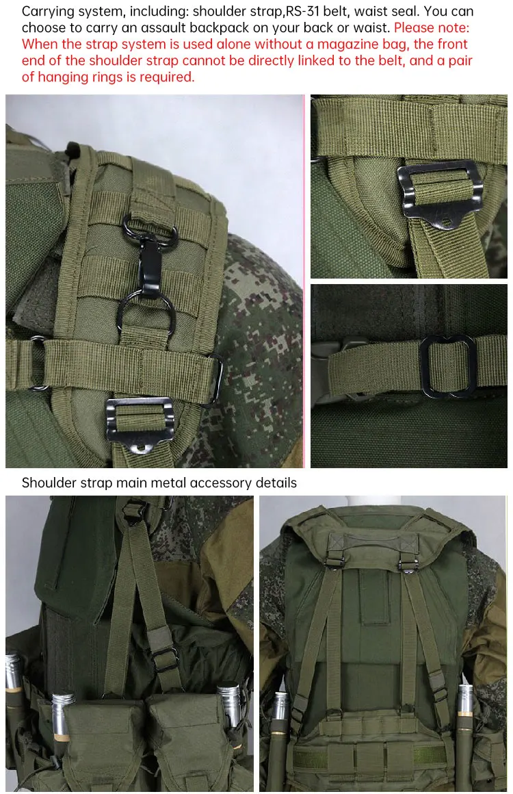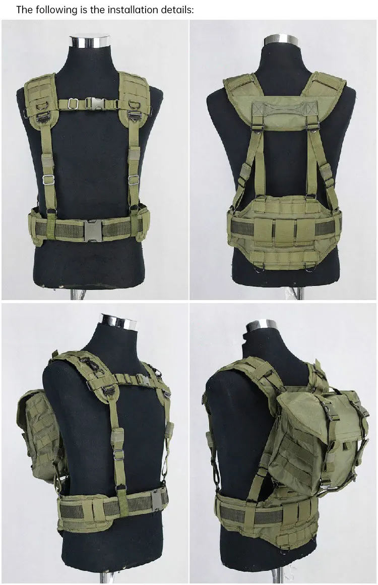 El dispositivo está diseñado para transportar equipos en terrenos accidentados durante mucho tiempo, así como señales, comunicaciones, equipos médicos y otros dispositivos.A través del diseño especial de ambos lados y cintura, aún puede mantener la comodidad de uso a plena carga, principalmente moviendo el centro de gravedad de municiones y equipos cerca del centro del cuerpo humano, de modo que el peso se pueda agarrar al estómago. No causará disipnea ni afectará la ventilación.