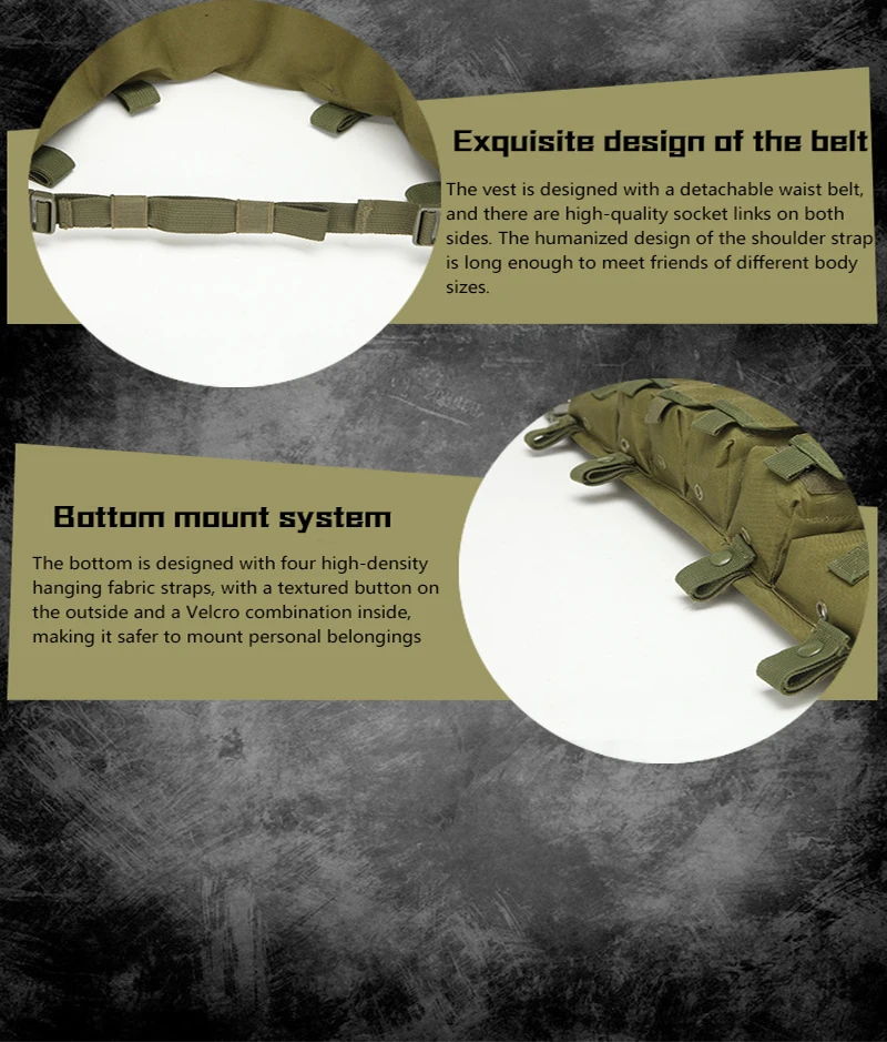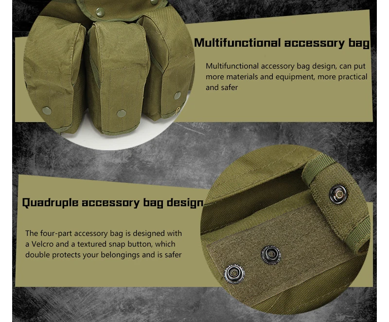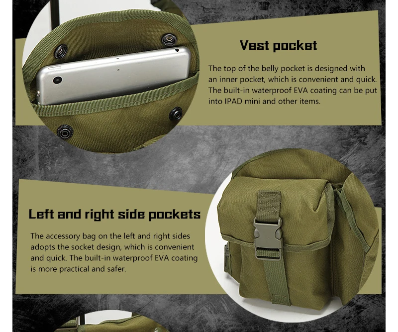 2.Puede equiparse con walkie-talkies o dispositivos inalámbricos como teléfonos móviles, GPS, detectores electrónicos, etc.Es más cómodo y rápido.El bolsillo también puede guardar llaves, mapas, teléfonos móviles y otros accesorios.