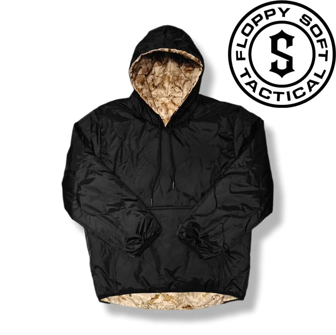 Esta chaqueta acolchada de algodón con capucha, impermeable y cálida, de doble cara, te permite usar un lado en color AOR1 y el otro lado en negro con bordado blanco.