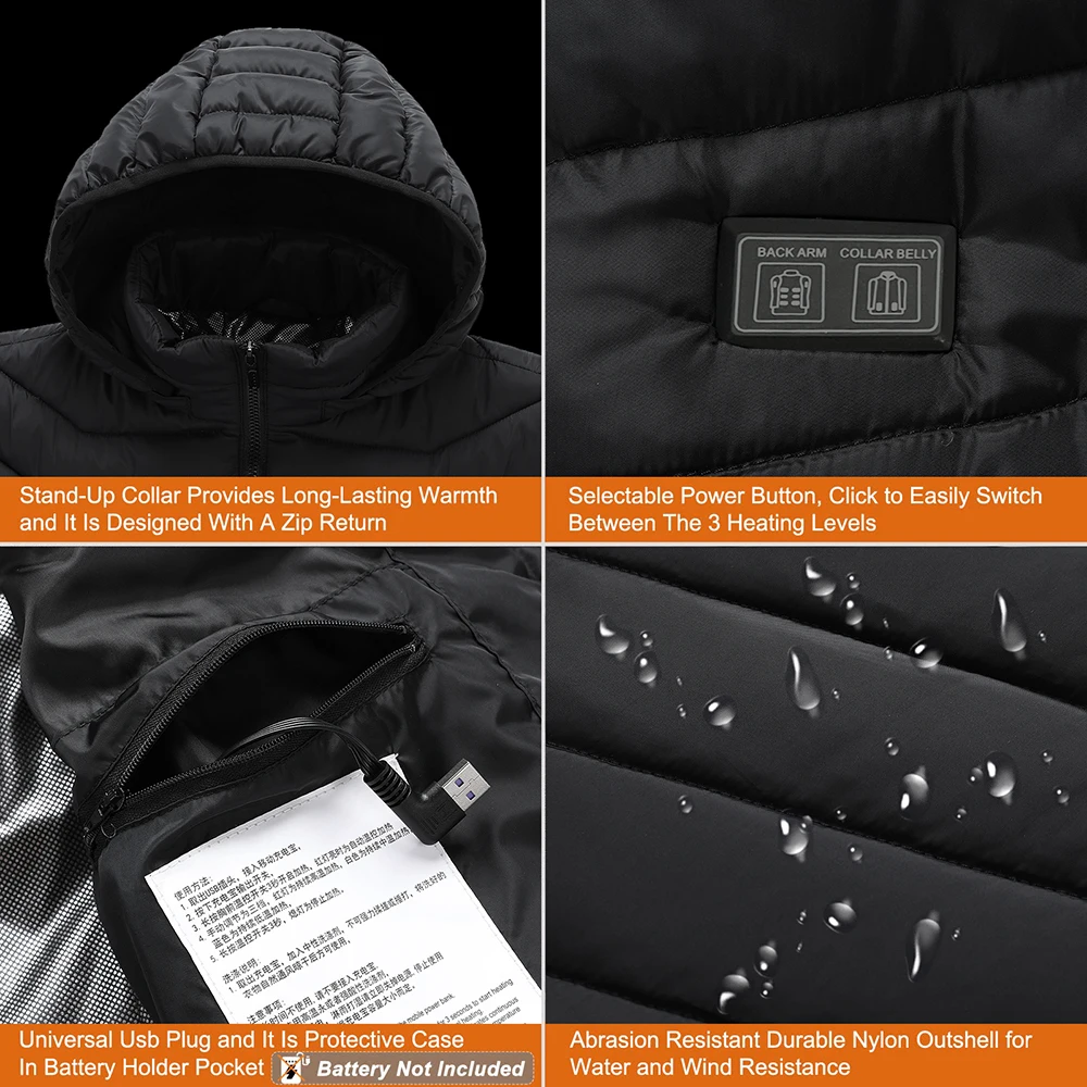 (6). Seguro y ligero: el sistema de calefacción mejorado puede garantizar que disfrute de una calidez cómoda. El calentador de alambre de fibra de carbono de área grande es seguro y aislado. Cómodo y agradable para la piel, tacto suave y mejor calidez. Puede ayudarte a pasar todo el invierno fácilmente sin usar ropa grande en condiciones de frío.