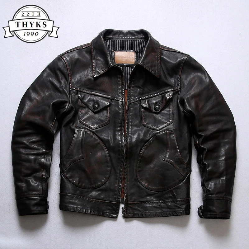 Chaqueta corta de Cuero genuino para Hombre, abrigos de motocicleta de vaquero clásico de lujo, informal, Delgado, Vintage