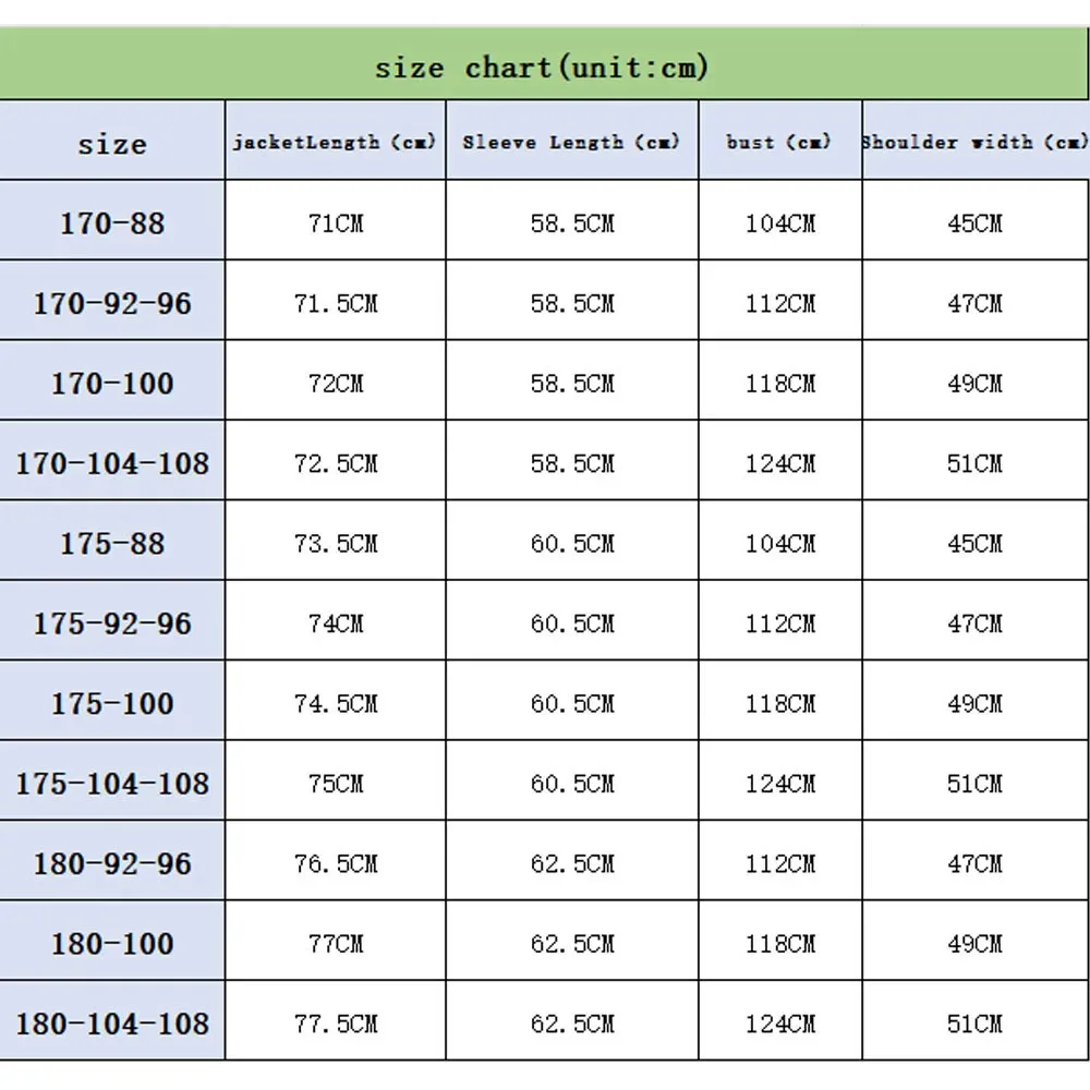 Los datos 170 – 88 son para circunferencia de altura y torácica.Puedes elegirlo razonablemente según tu propia talla. Los datos de la chaqueta se basan en la talla de otra ropa, que se reproduce por completo.Si quieres lucir un efecto más largo, puedes elegir una talla más grande que tu altura, como 170-88, y puedes elegir 175-88