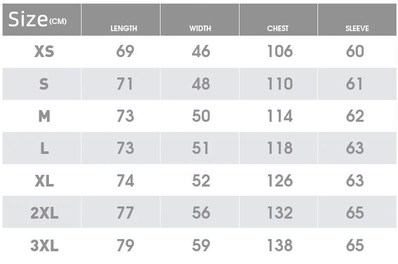 La Tabla de tallas es la siguiente, elige según el tamaño de tu cuerpo. Hay un margen de error de 1-2cm, si no está seguro del tamaño, envíeme la información de su altura, peso y cintura, le ayudaré a elegir la talla correcta.