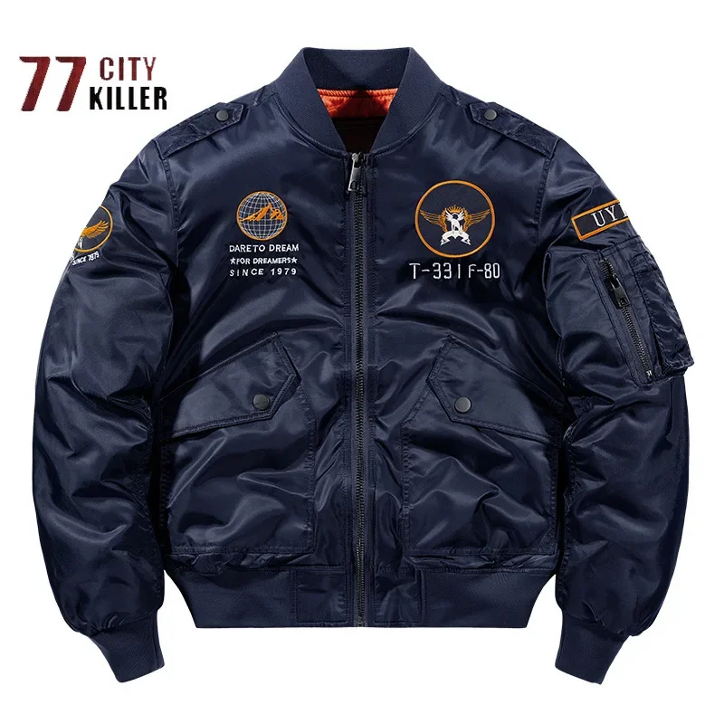 Chaqueta de piloto gruesa y cálida para hombre, cuello levantado, bordado Vintage, uniforme de béisbol informal y suelto, moda de invierno