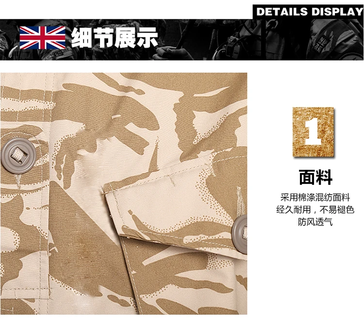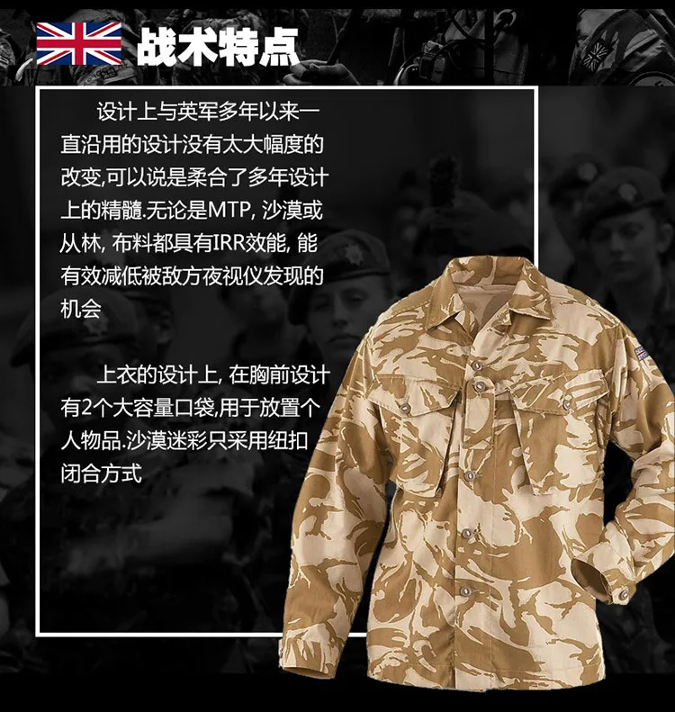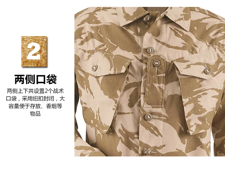 El diseño no ha cambiado mucho con el diseño utilizado por el ejército británico durante muchos años, lo que se puede decir que es la esencia del diseño durante muchos años.Ya sea MTP, desierto o bosque, la tela tiene efectividad IRR, lo que puede reducir eficazmente la posibilidad de ser detectada por el equipo de visión nocturna enemigo. El diseño de la camisa tiene 2 bolsillos de gran capacidad en el pecho para guardar objetos personales.El camuflaje del desierto solo usa Cierre de botón