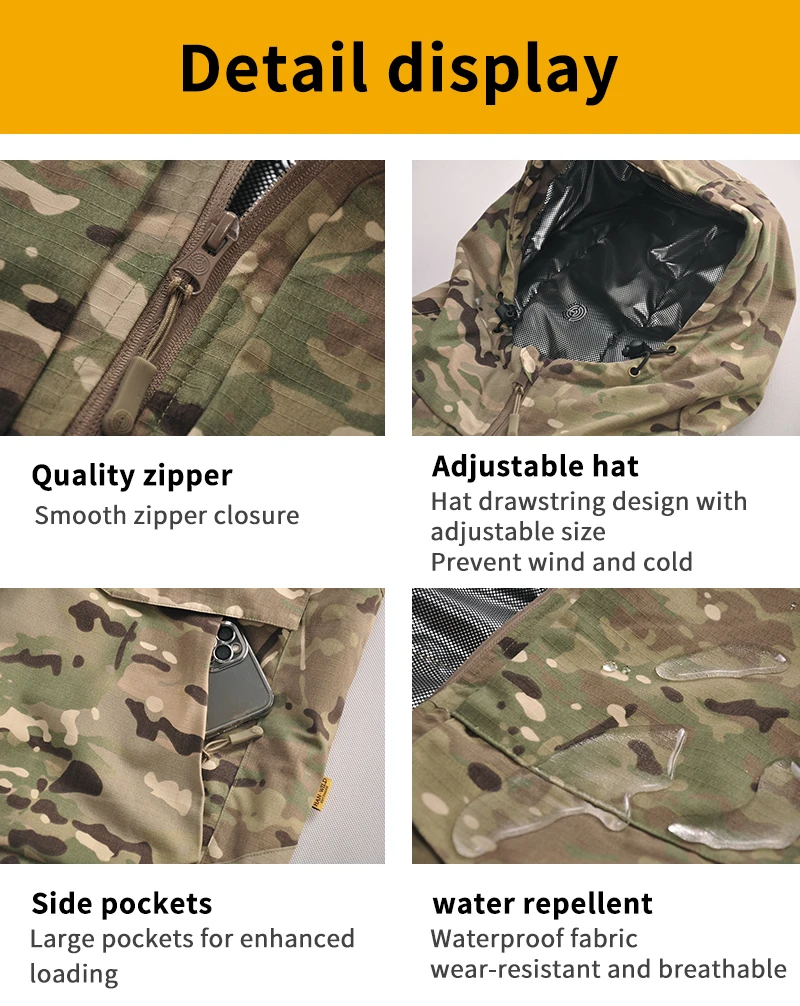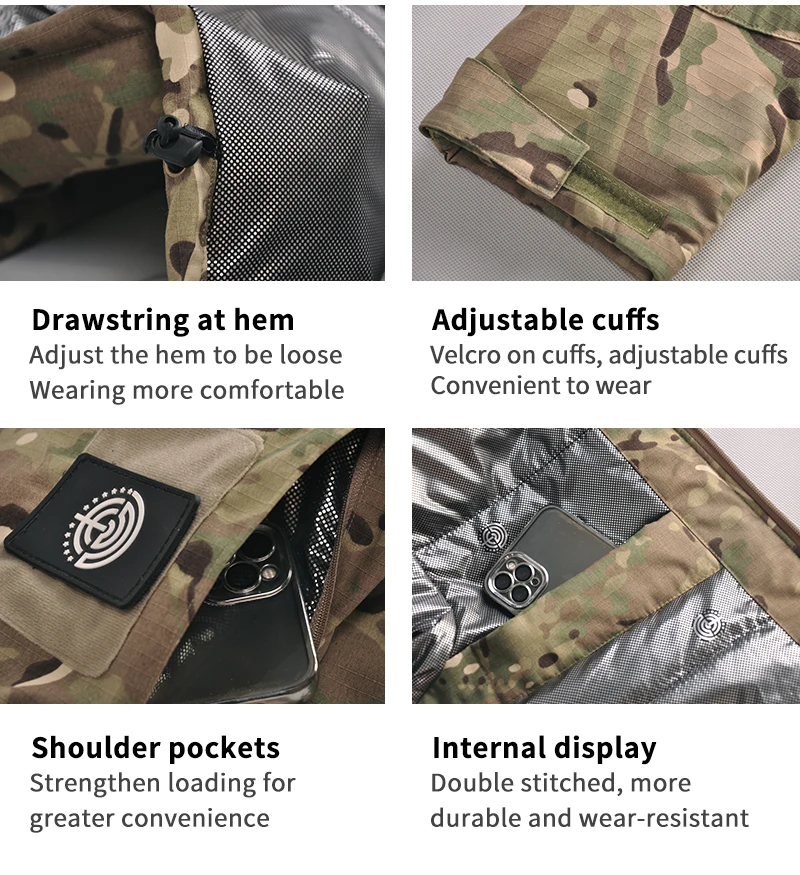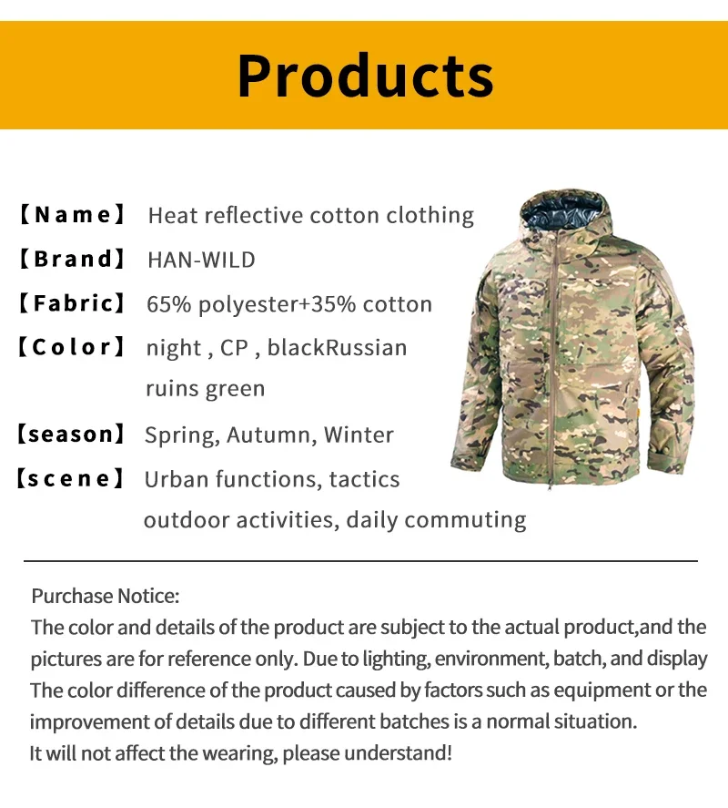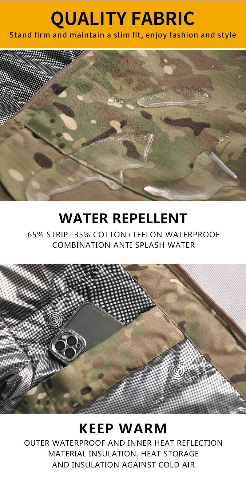 Material:Algodón + Poliéster Característica: 1.La tela tiene una proporción científica de algodón y poliéster, que es resistente al desgaste, a los arañazos y al desgarro. 2.El interior está hecho de material reflectante del calor, que puede almacenar calor, mantenerse caliente y mejorar la resistencia al frío. 3.Tecnología repelente al agua, hace frente fácilmente a la lluvia ligera al aire libre. 4.Diseño de múltiples bolsillos, equipado con hebilla y cremallera de nailon, con mayor capacidad y mayor seguridad.