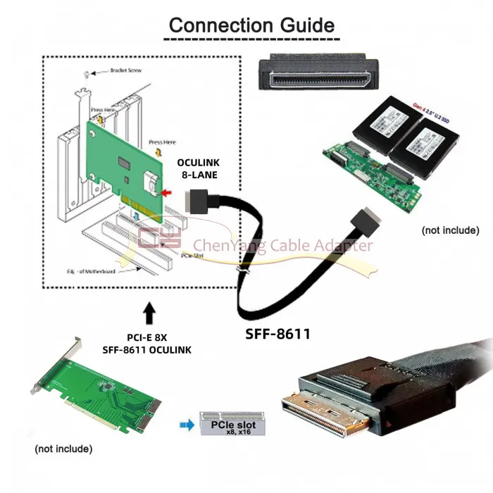 Por ejemplo, un plano posterior con conector OCuLink a un controlador con conector 8x OCuLink.