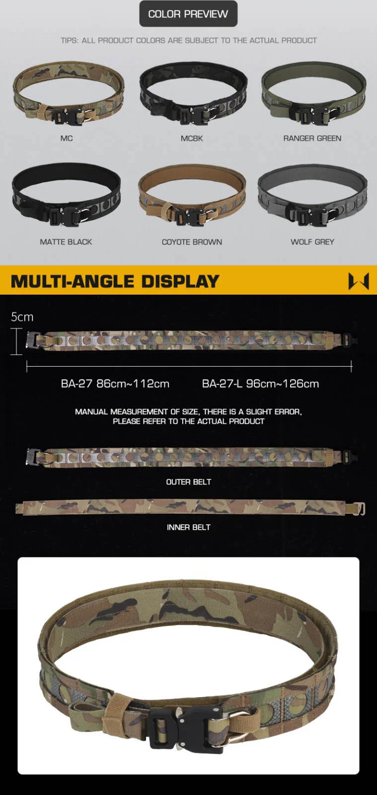 Esta es una réplica realmente impresionante del producto original. El tono de verde coincide perfectamente con el color auténtico de "ranger green", haciéndolo prácticamente indistinguible del producto real. Definitivamente, el cinturón más duradero y cómodo que he usado en mi vida. El cinturón interior es tan cómodo que, de hecho, lo uso a diario. La única desventaja de este producto es que se anuncia que el cinturón tiene un anillo de seguridad con un cordón "plateado" en la parte frontal; sin embargo, el que tengo en mi cinturón es, de hecho, "negro". Sin embargo, no diría que este producto no merece menos de 5 estrellas.