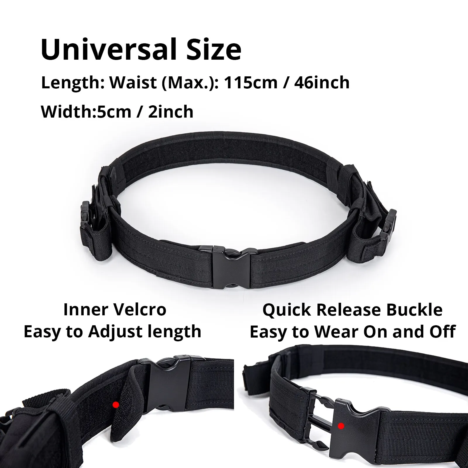 • Dos bolsas de revista de 9mm:Con dos bolsas de revista de 9mm, este cinturón es perfecto para llevar municiones adicionales durante el combate o el deber de seguridad.