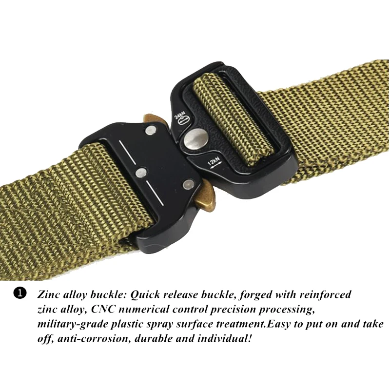 【Cinturón táctico de alta resistencia para hombre】: Este cinturón de tela está unido a una hebilla militar hecha de metal de alta resistencia. Este amable diseño hace que este cinturón de tela de nailon de estilo militar sea lo suficientemente duradero. Ampliamente utilizado para entrenamiento militar o expedición de camping al aire libre. 【Totalmente ajustable】: Grande. Longitud del cinturón militar: 125 cm. 【Alta calidad】: Hebilla de metal de liberación rápida. Funcionalidad de liberación rápida intuitiva y suave Cuando empujas las pestañas doradas hacia abajo al mismo tiempo. Cinturón de nailon 100%. Es transpirable y muy cómodo para el uso diario.