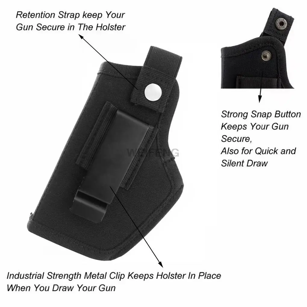 El clip para cinturón resistente garantiza que la funda permanezca en su sitio cuando dibuja su arma. El botón a presión en la correa de retención es lo suficientemente fuerte como para que no falle.