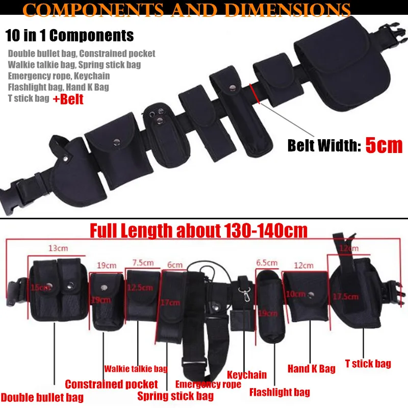 -Cinturón ajustable grueso de 2 "de alta resistencia, apto para cintura de 35-54 pulgadas -Fabricado con nailon 600D brillante de buena calidad. Es firme, pesado y brillante. Incluye: 1 x funda de llave silenciosa. 1 x funda para manillar. 1 x funda para linterna. 1 x funda de doble cargador. 1 x funda para herramientas de caza. 1 x funda para bastón extensible. 1 x bolsa para buscapersonas o teléfono móvil. 1 x funda para una radio(walkie talkie). 1 x funda para mace o spray de pimienta. 1 x correa para evitar que el cinturón se salga. 1 x cinturón de nailon ajustable Paquete del producto: 1 piezas x cinturón de trabajo táctico (incluye accesorios de 10 piezas
