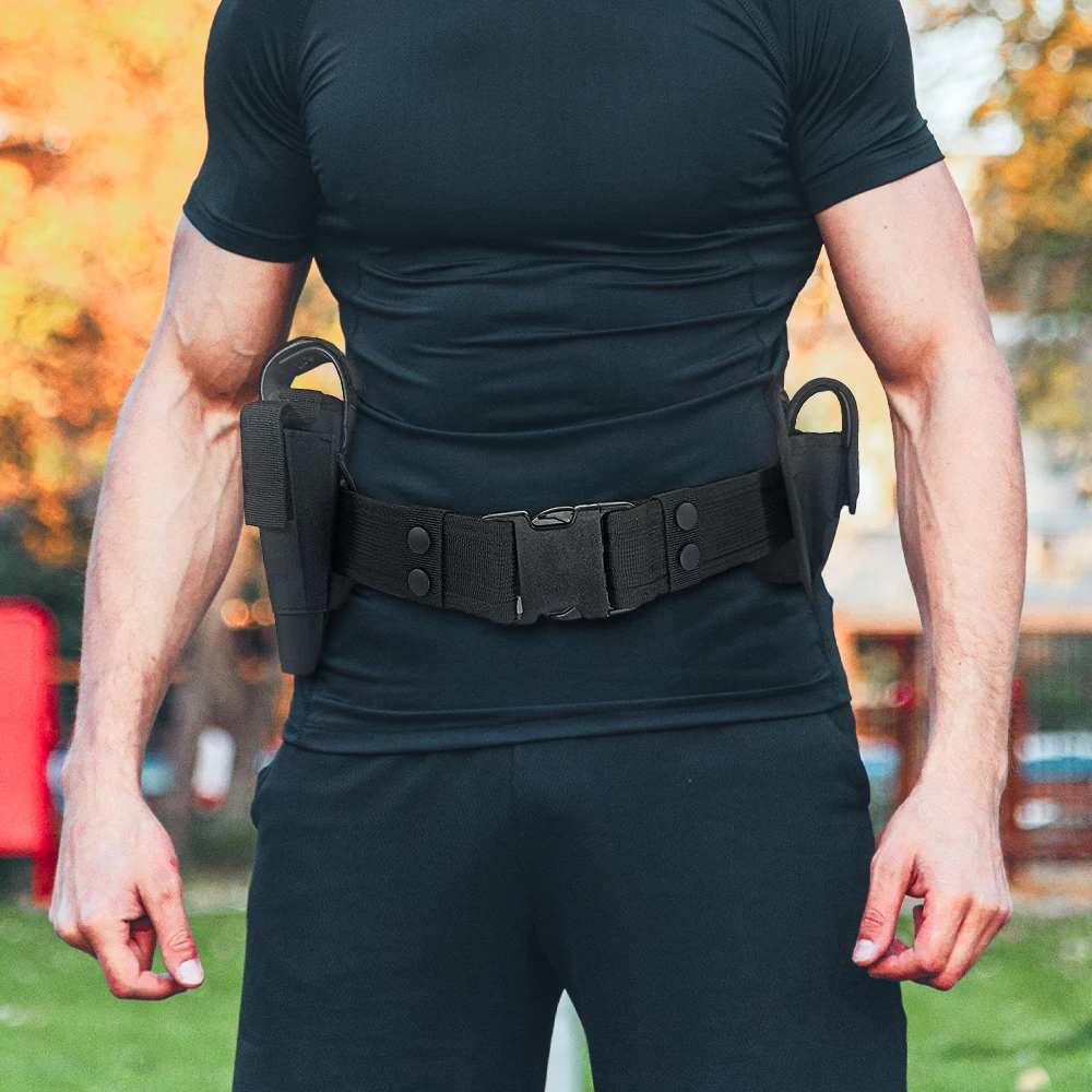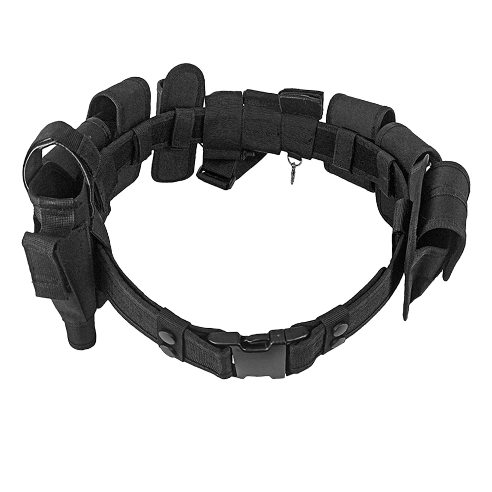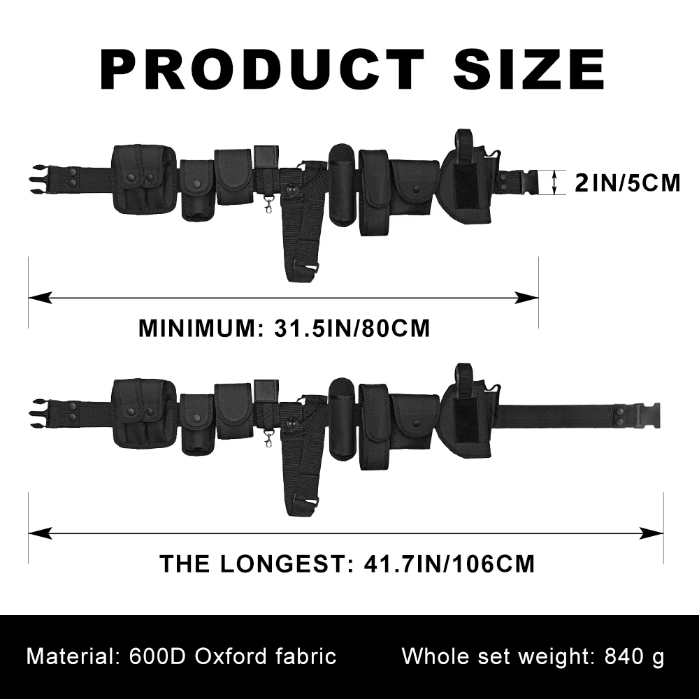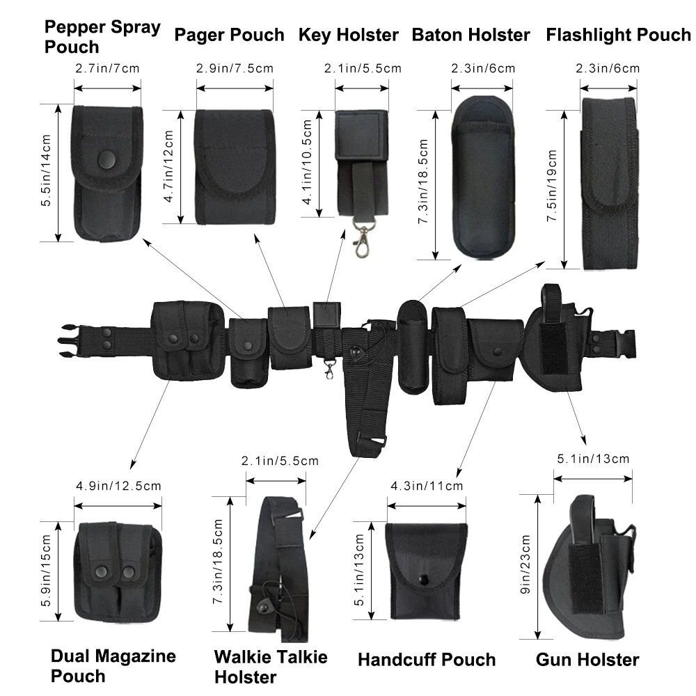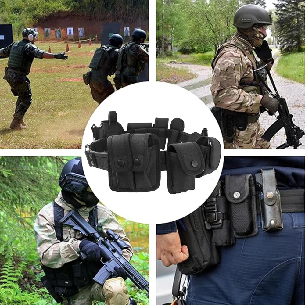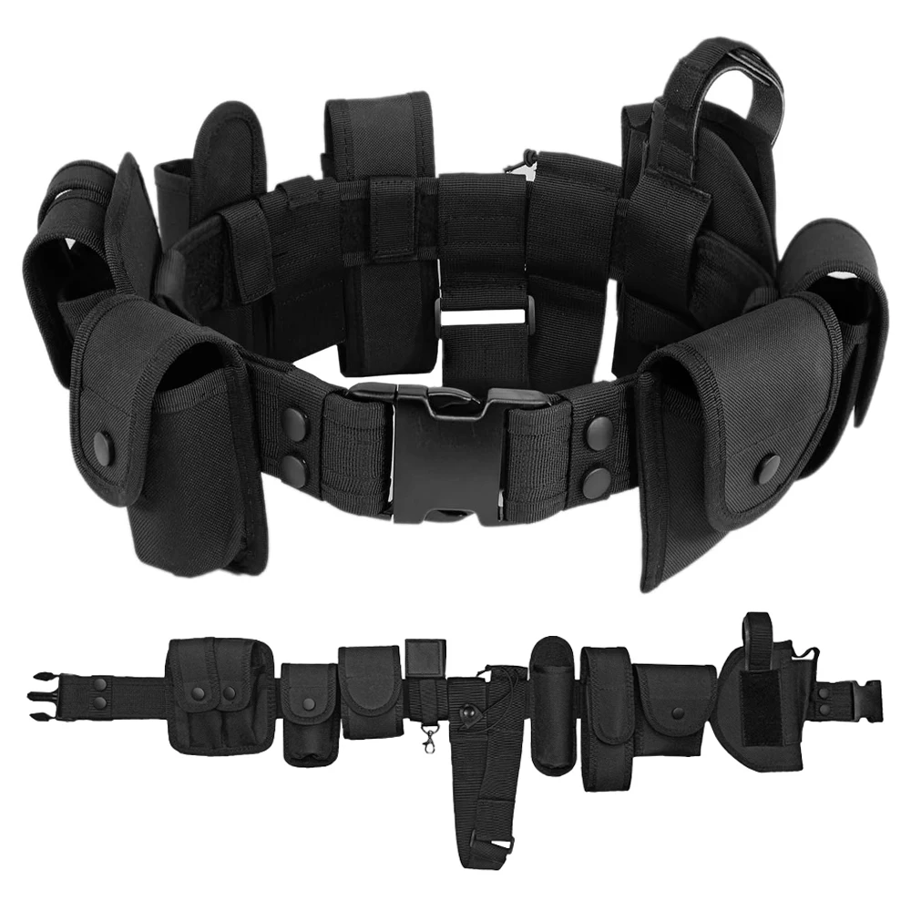 Cinturones de servicio de aplicación de la ley 10 en 1 con funda: cinturones y bolsas de seguridad para caza 10 en 1: un cinturón negro táctico con 9 bolsas de fundas tácticas de componentes multifuncionales variados, que incluyen bolsa para linterna, bolsa para pistola, estuche para walkie-talkie, estuche para cuerda, manguereta, bolsa para cartuchos, porta llaves, soporte para bastón, manguera para bastón en forma de T.