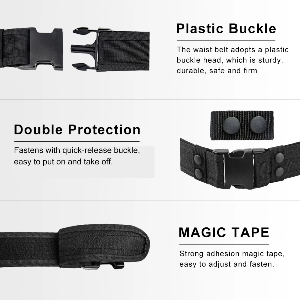 Cinturón modular táctico extraíble de componentes: se pueden quitar 9 fundas multifuncionales de diferentes diseños para obtener un cinturón de utilidad totalmente personalizable.Se sujeta con hebilla de liberación rápida, fácil de poner y quitar.