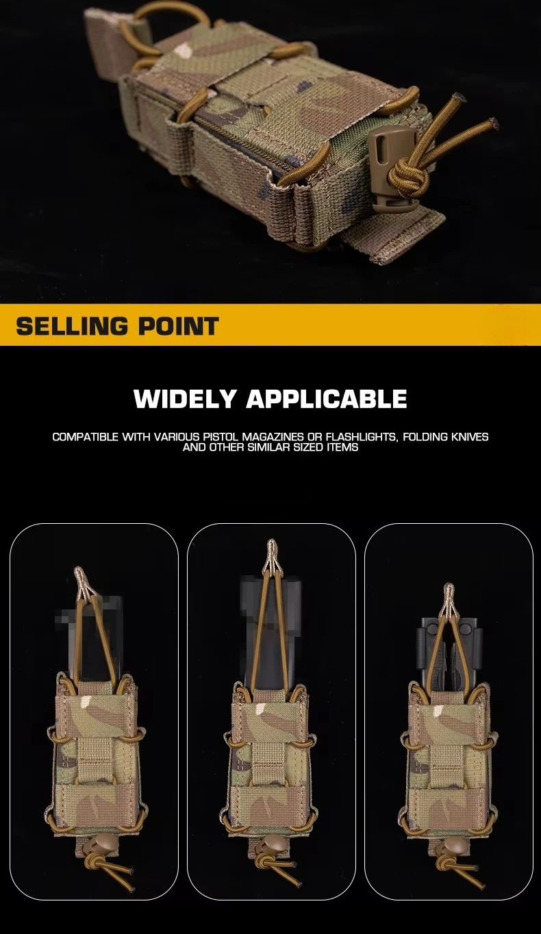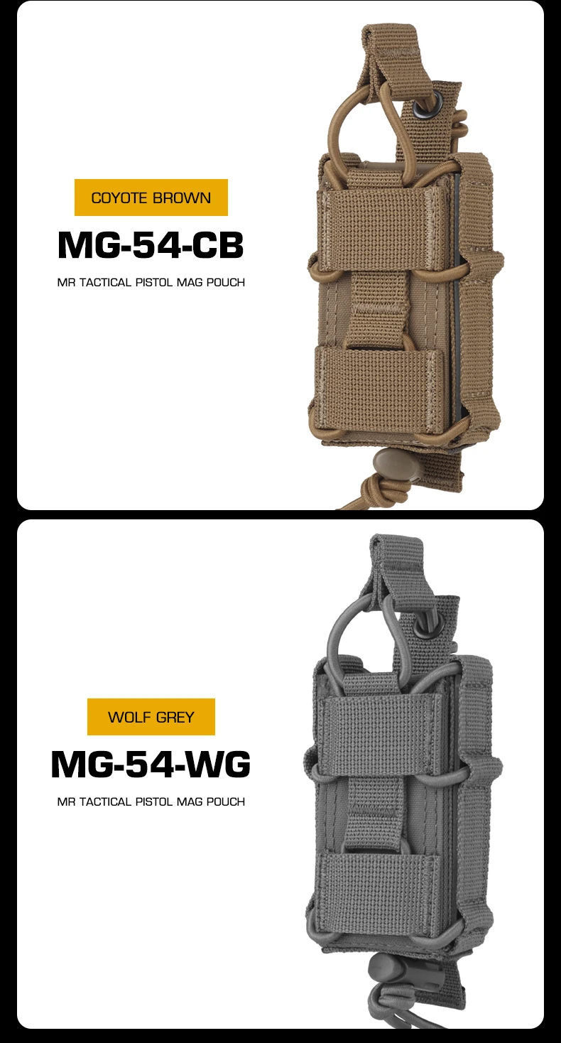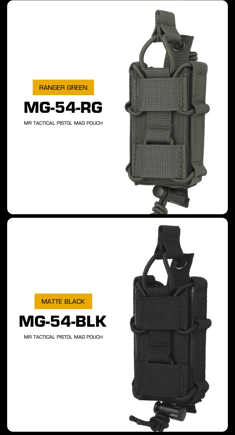 Descripción del producto Bolsa magnética de 9mm, soporte MOLLE de extracción rápida, Clip elástico para soporte de placaInformación del producto Artículo No.:MG-54 Escena aplicable: actividades en equipo, juegos al aire libre, accesorios de películas.