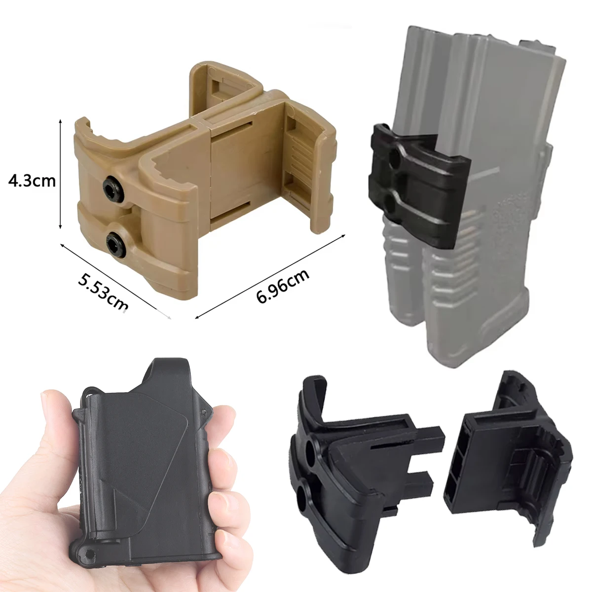Allows for fast reload Impact resistant ABS construction provides light weight and resists operational abuse Wide-set, two-piece bolt-on design resists flexing Integral grooves interface with PMAG ribbing to eliminate slippage 2 color for choice: Black, tan Package include: A Magazine Parallel Connector +Allen wrench