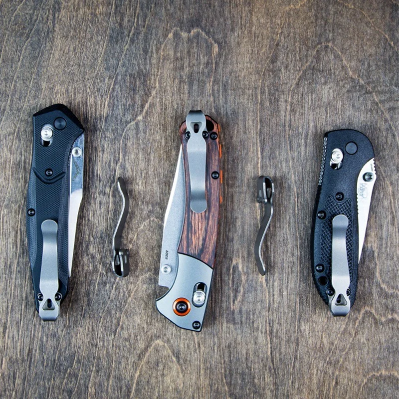 Los clips Benchmade/Emerson/ProTech se ajustan a la mayoría de Emersons, así como a algunos de los modelos más comunes de Benchmade, incluidas las series Griptillian y Mini-Grip, Bugout y la serie 940, entre otros. Este diseño también funciona con varios cuchillos ProTech y ZT. Consulta la lista de compatibilidad a continuación.