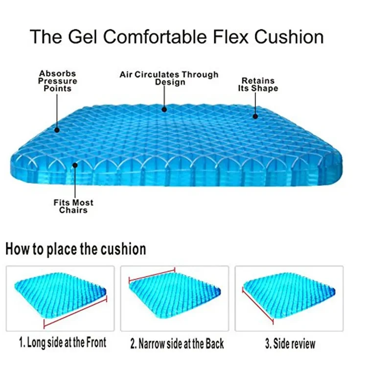 4.Se adapta a la mayoría de las sillas para aliviar profundamente la presión del asiento.Diseño único de panal Flex-Grip: este cojín salta por delante de la curva con su exclusivo diseño de panal flex-grip.