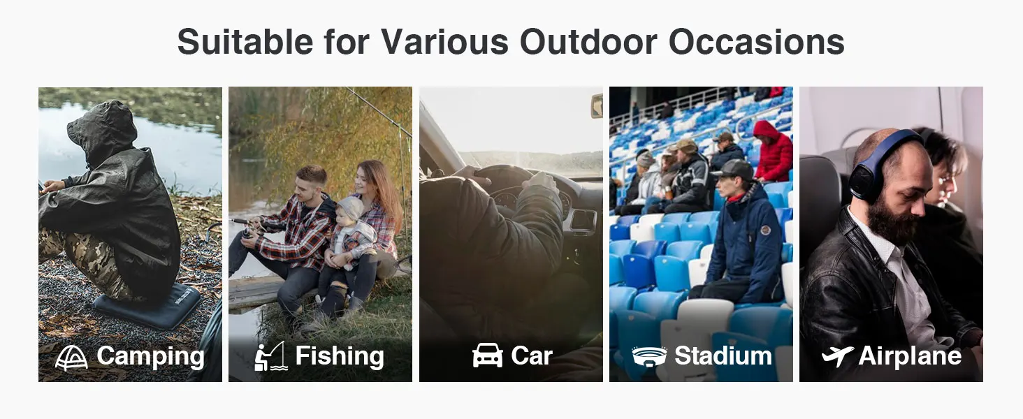 Lightweight and Compact:This inflatable cushion is very lightweight and compact, weighing only 0.4 pounds, and can be folded into a small size of 6.2x3.5 inches. It is easy to fit into a backpack or pocket and is an essential companion for concerts, sports events, camping, hiking, and airplane travel