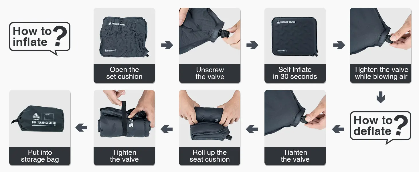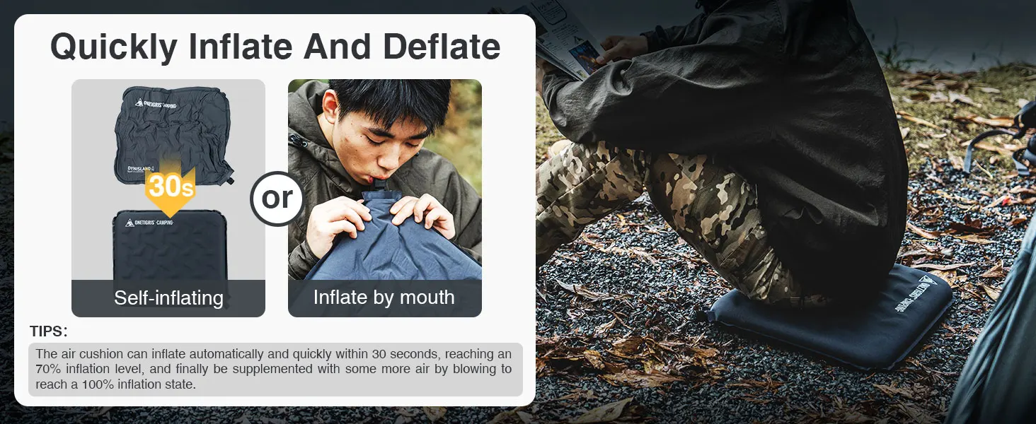 Rapid inflation and Storage: Camping seat cushions will automatically inflate and can be quickly inflated within 30 seconds, or manually inflated with just a few breaths to adjust the hardness and comfort of the cushion. When you are ready to pack, simply release the valve and roll it up for easy travel and storage