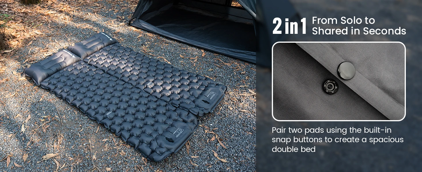 Confeccionada con un resistente tejido de poliéster 190T con un revestimiento de TPU, esta alfombra es resistente al desgarro, fácil de limpiar y está diseñada para durar.Con un peso de sólo 1,6 lb (760 g) y plegado de forma compacta, es el compañero perfecto para acampar, hacer trekking o incluso para uso doméstico.¿Quieres más espacio?Los conectores de botón a presión le permiten vincular dos tapetes para una acogedora cama doble, ideal para compartir la aventura con familiares o amigos.Libera y siéntete en casa.