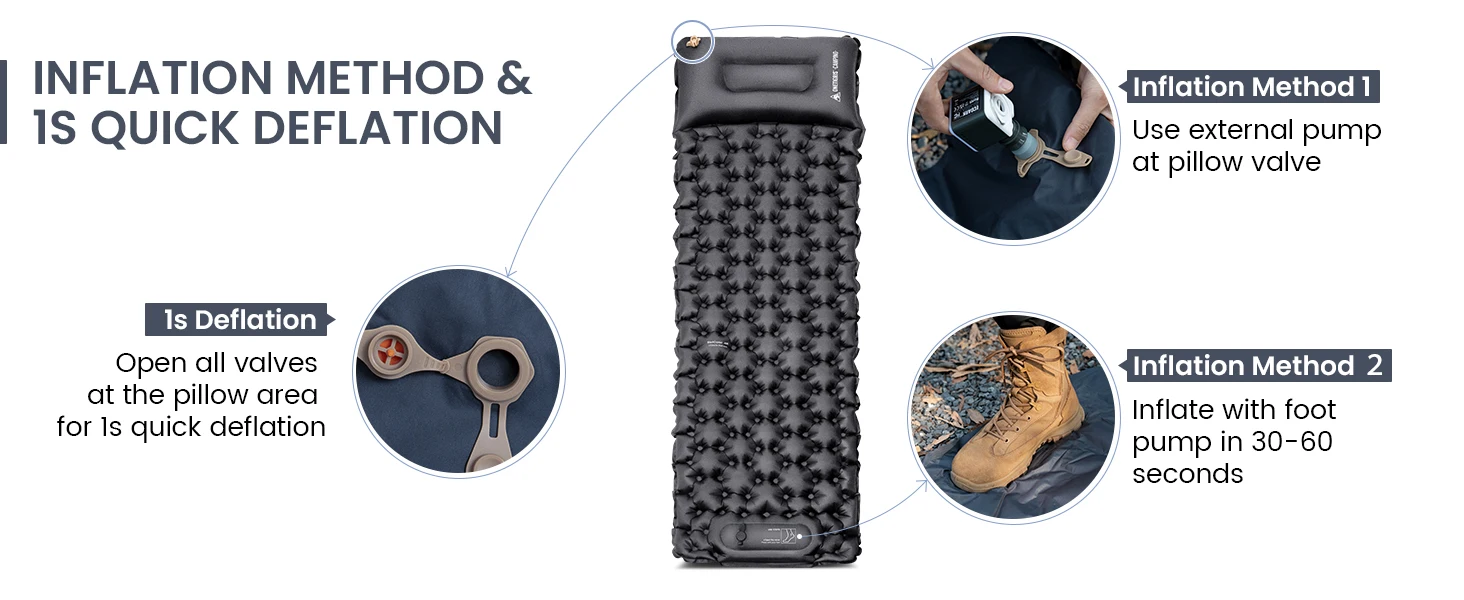 | FÁCIL ENTRAR/DEFLAR: Bomba de pie incorporada en la parte inferior para inflar en un minuto para uso inmediato, con una almohada de firmeza ajustable y se desinfla en 1 segundo.