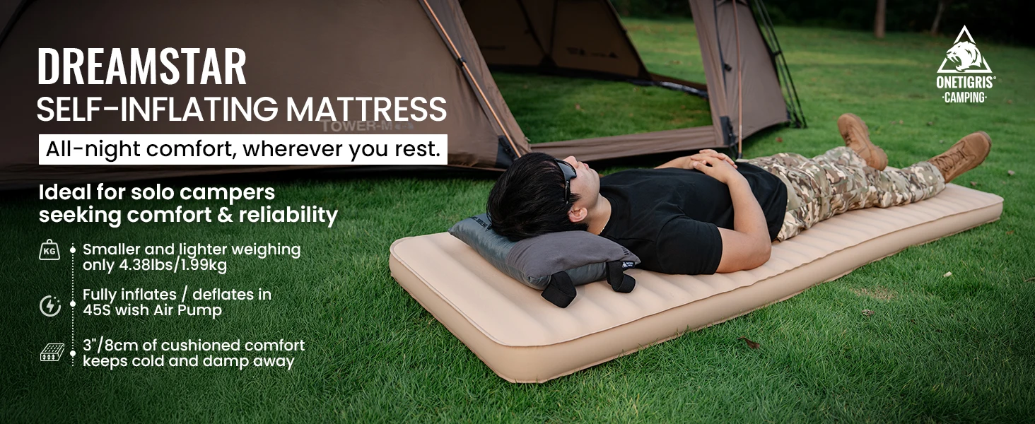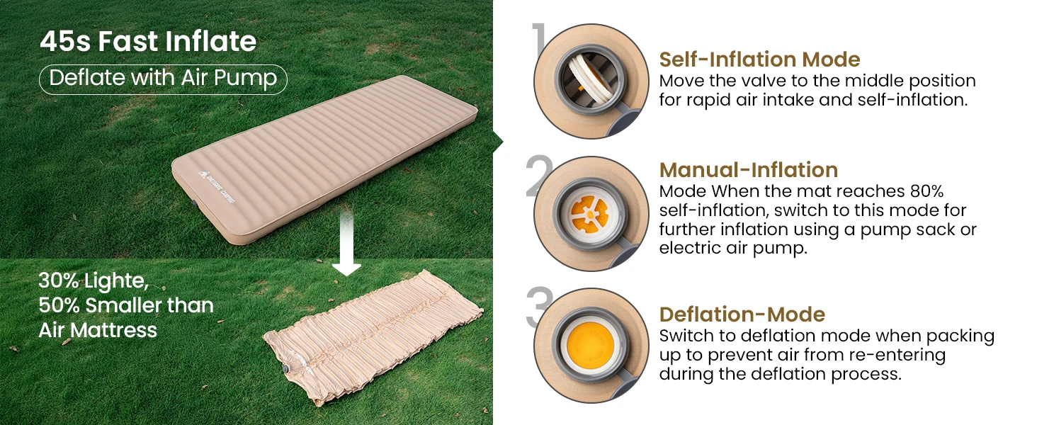 Inflado/Desinflado Rápido: Se autoinfla hasta el 80% al desplegarse y se llena al 100% con 2-3 presiones de la bomba de aire incluida con el producto.