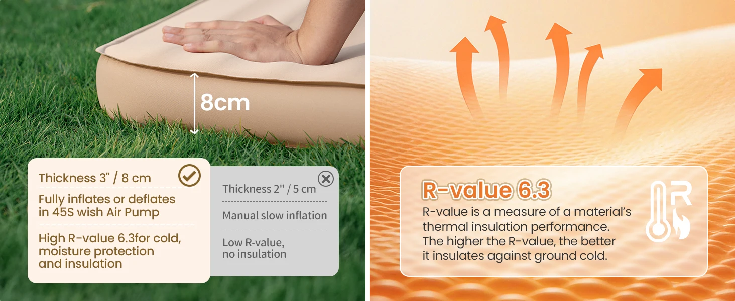 Extra Bounce: El colchón tiene 3” (7.6cm) de grosor, con un borde reforzado y relleno de espuma sólida para un extra de rebote que proporciona a los campistas un sueño de 5 estrellas; este diseño también genera menos ruido cuando el durmiente se mueve por la noche.