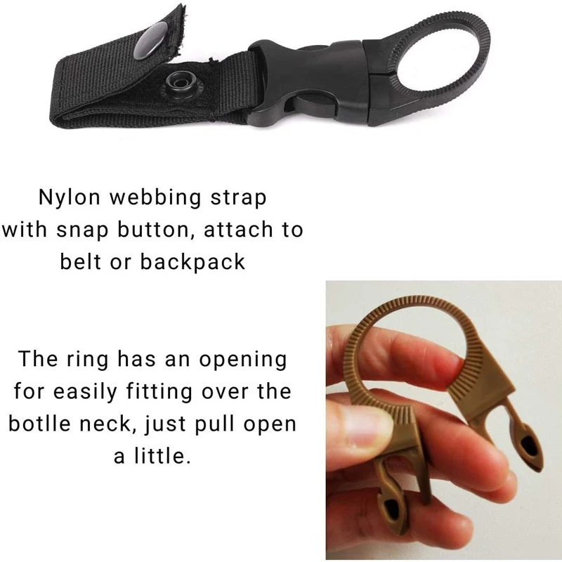 3. El clip para botella consiste en una correa de nylon y un anillo de plástico, las dos partes están conectadas por una hebilla de liberación rápida de plástico.