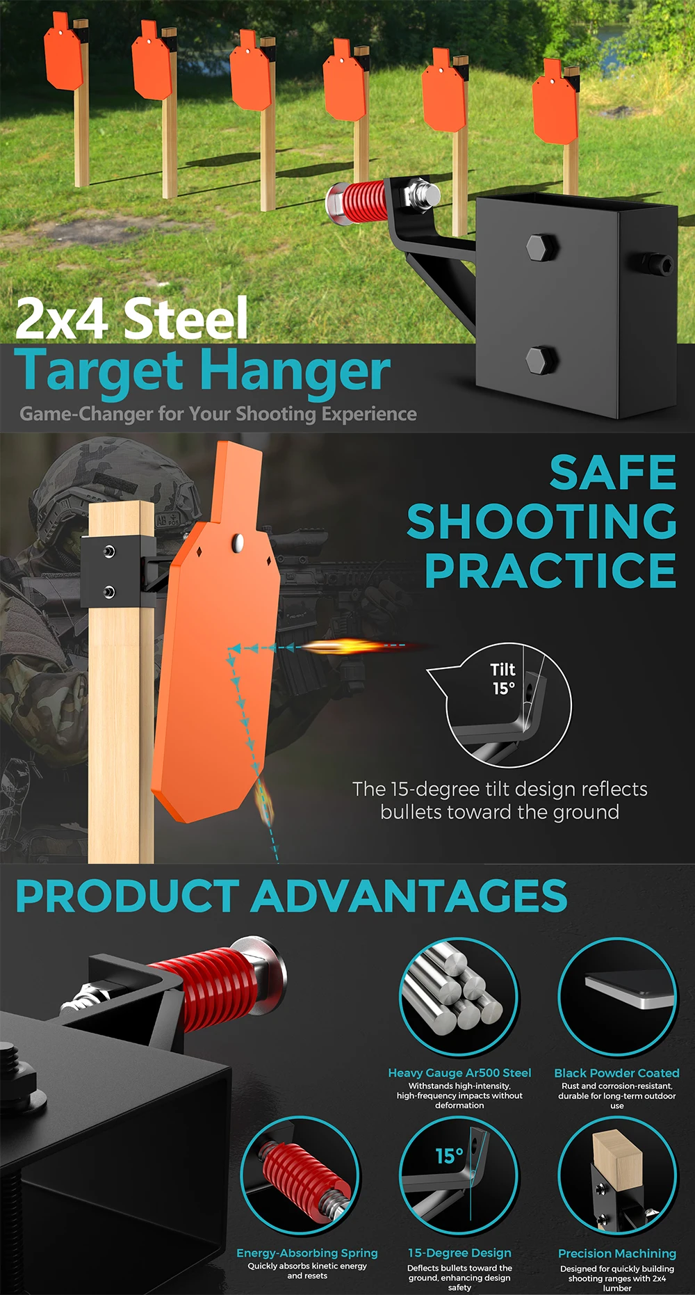 El colgador de acero para objetivos 2x4 está diseñado para construir una plataforma de tiro simple, rápida y segura y funciona bien con gong/placas de acero AR500 en un soporte de 2x4".Le permite disfrutar de la diversión de disparar rápidamente y sin preocupaciones y hacer que los disparos al blanco a largo alcance y corto alcance sean mucho más agradables.