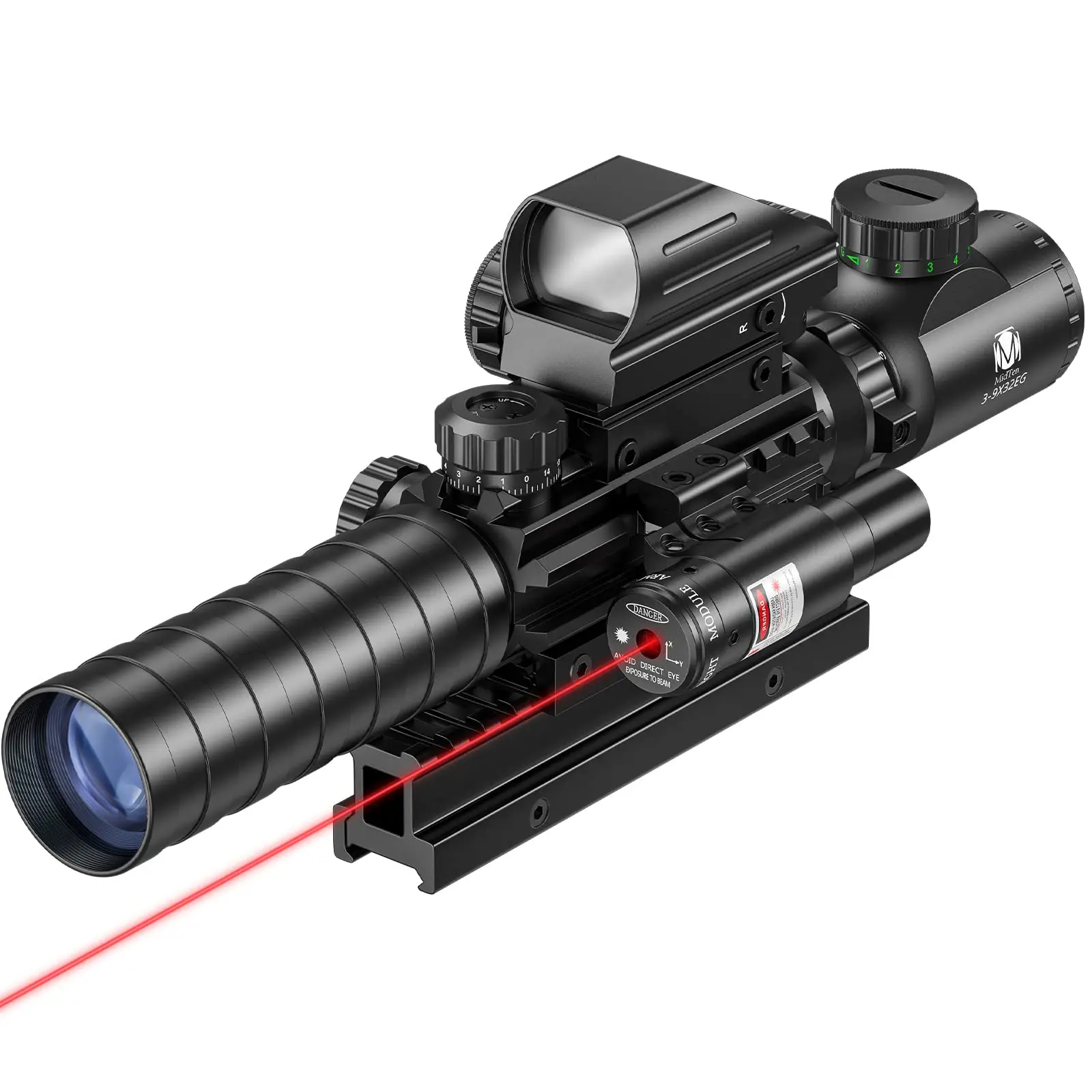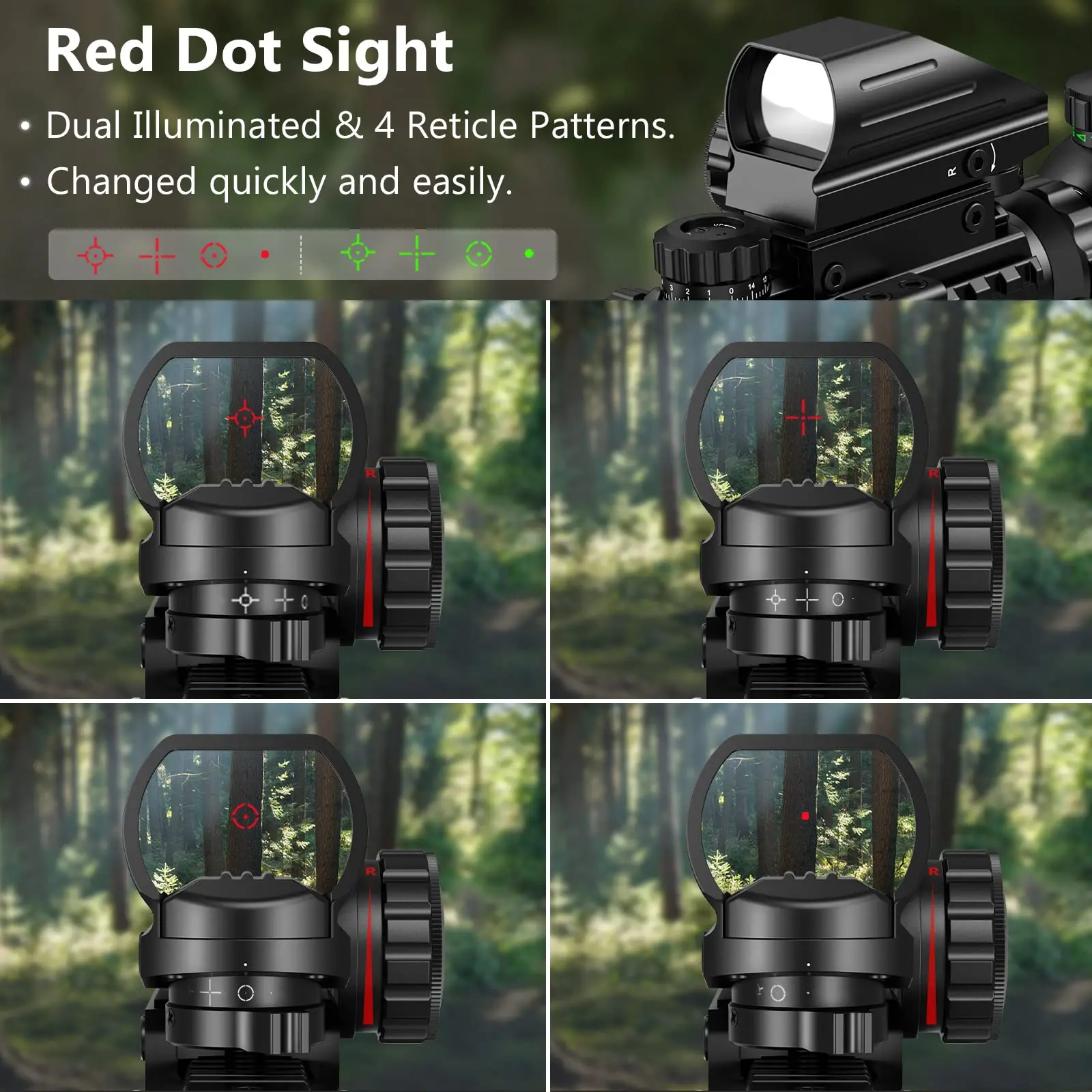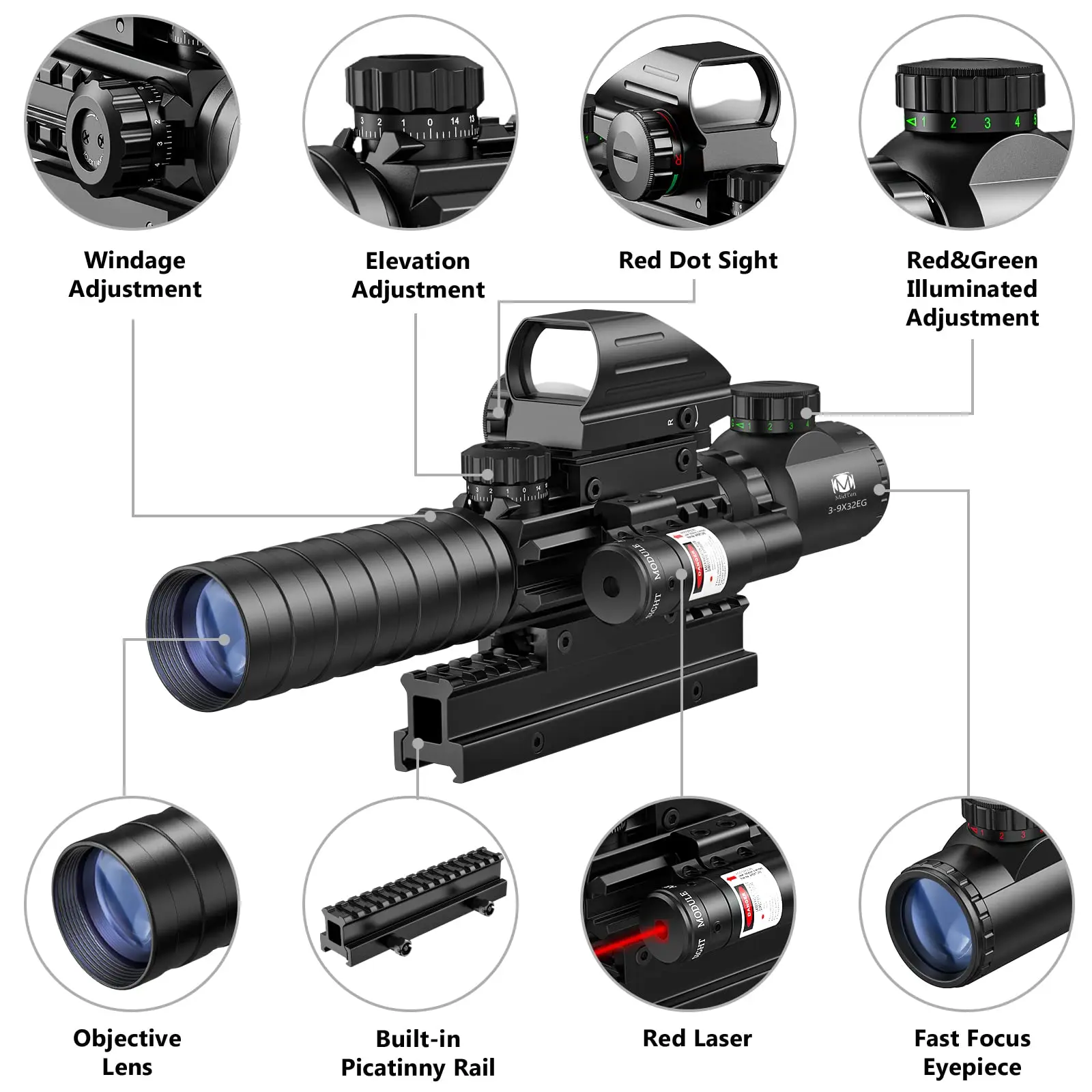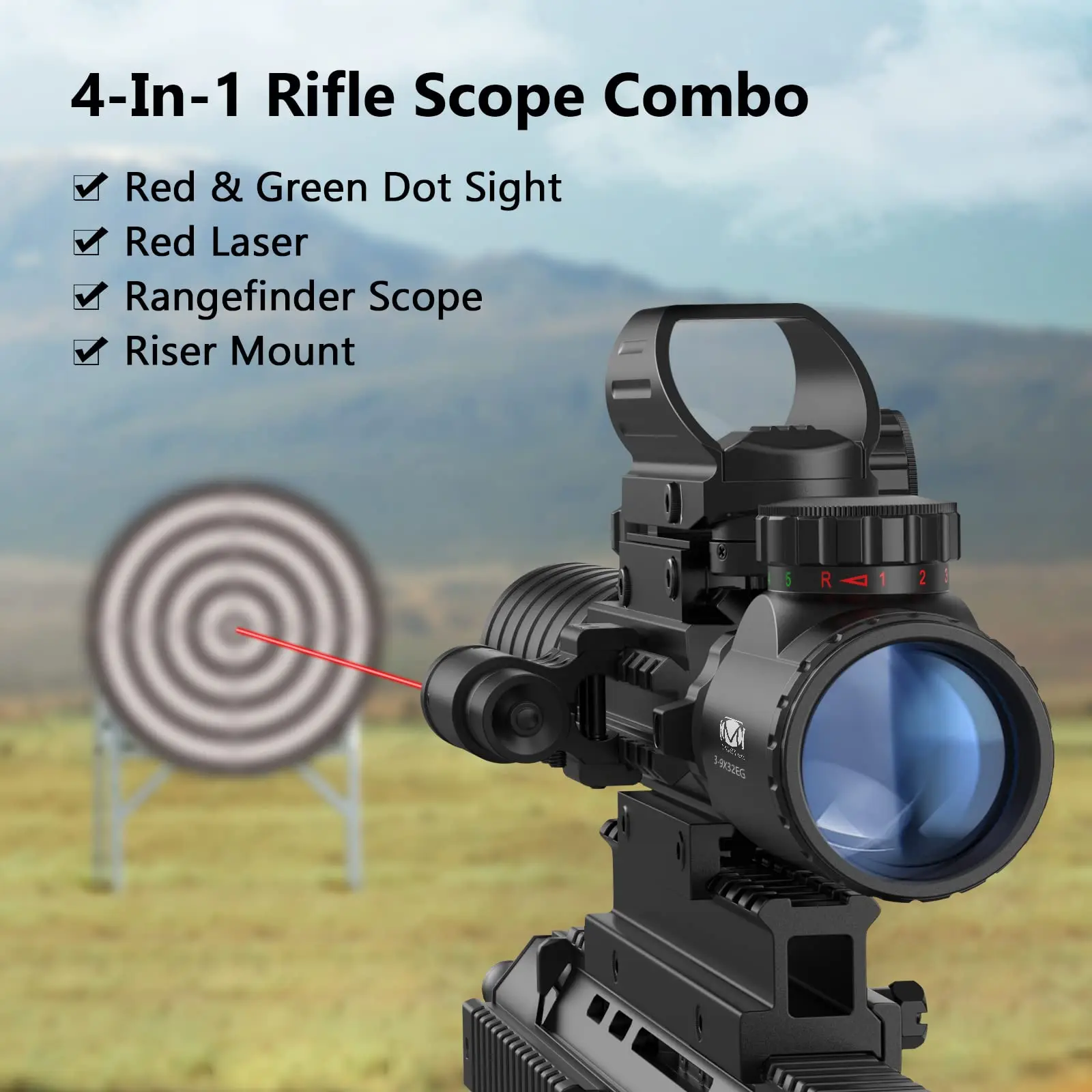 Combo de punto rojo 4 en 1 mejorado y alcance de lupa: el espejo retrovisor mejorado y altamente duradero mejora el problema del modelo anterior.Viene con un telescopio de telémetro, una mira láser verde, una mira de punto rojo/verde y una montura picatinny.Una selección para todo lo que necesitarás.