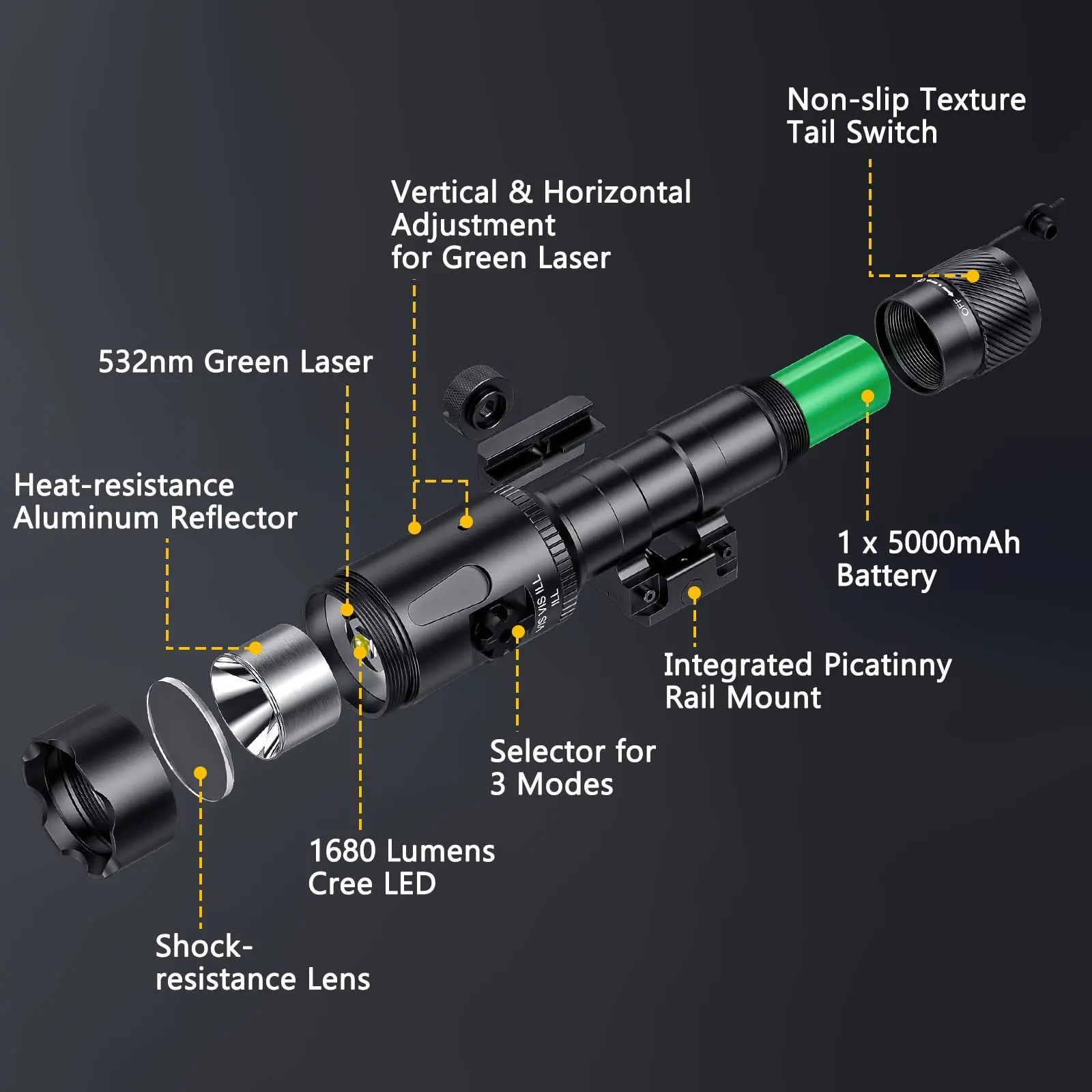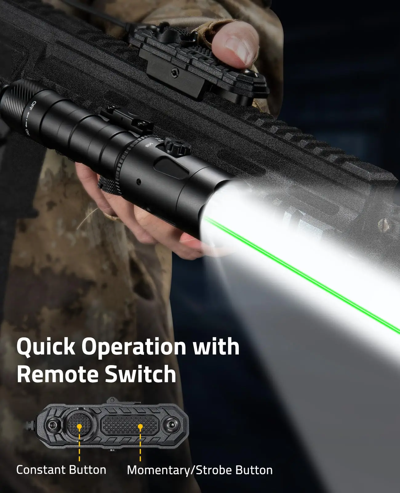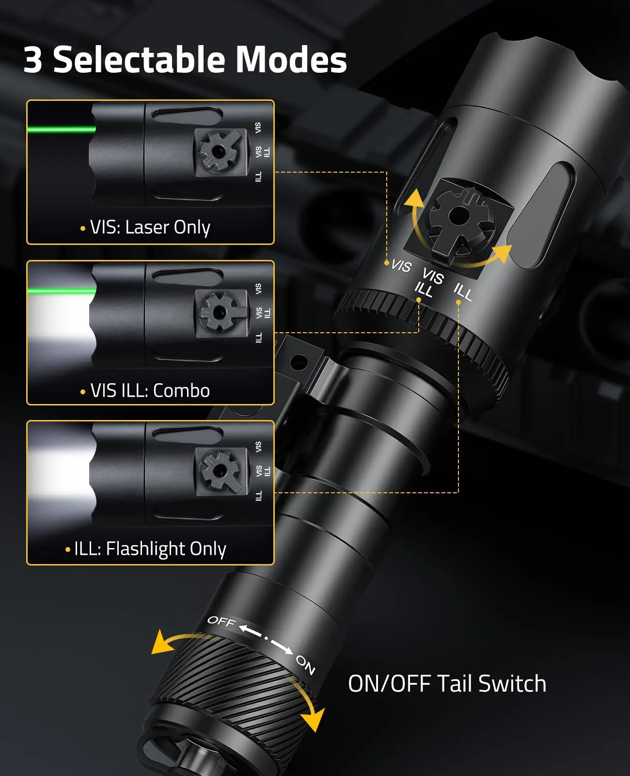 【VARIOS MODOS DE ILUMINA】 Este Combo láser de linterna de rifle está equipado con una nueva palanca selectora de modo para elegir entre solo luz blanca, solo haz verde o combo de luz láser. A través del interruptor giratorio en la parte inferior, puede cambiar entre luz estroboscópica y luz constante.