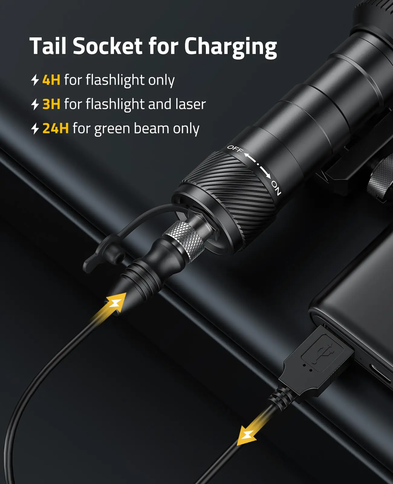 【CARGA COLES】El enchufe del extremo trasero se puede utilizar tanto para cargar como para conectar el interruptor remoto de presión. Simplemente conecte la luz láser a cualquier puerto USB y cárguela en aproximadamente 5,5 horas, lista para la acción