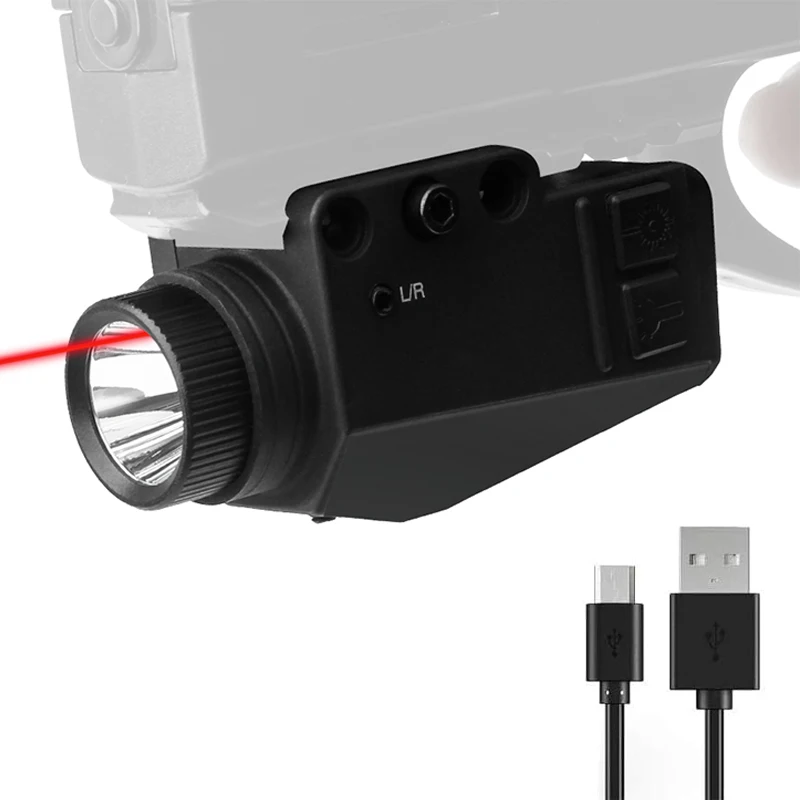 3. 【Batería incorporada recargable por USB】 La combinación de luces y haz de pistola funciona con una batería recargable incorporada.Una carga completa tarda 1,5 horas.Tiempo de funcionamiento: haz de 5 horas para pistola, linterna táctica de 1 hora o luz y haz de pistola de 45 minutos.Indicador rojo: Carga o batería baja; Indicador verde: carga completa.