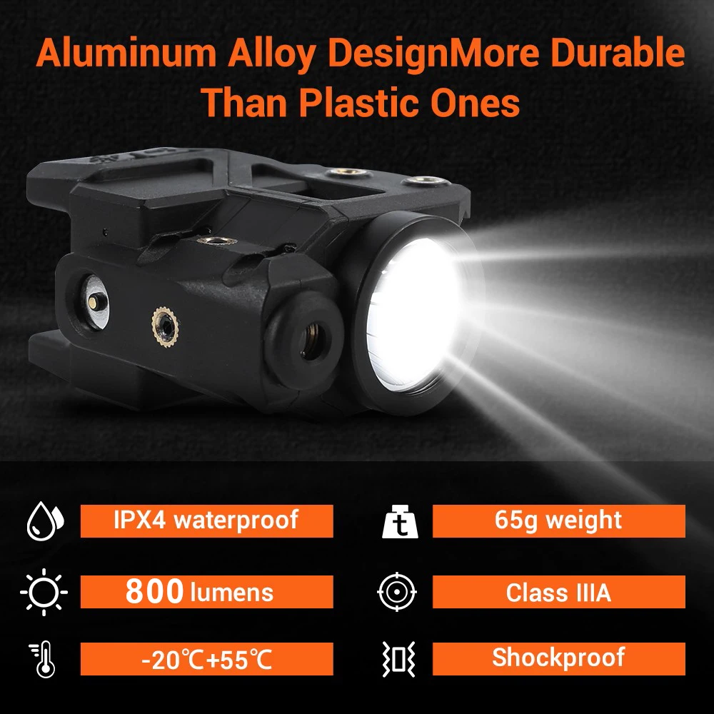 -Esta Luz de arma tiene un brillo máximo de 800 lúmenes y una mira láser verde brillante (Clase IIIa 5MW) que es mucho más visible durante el día.