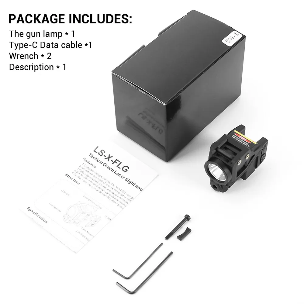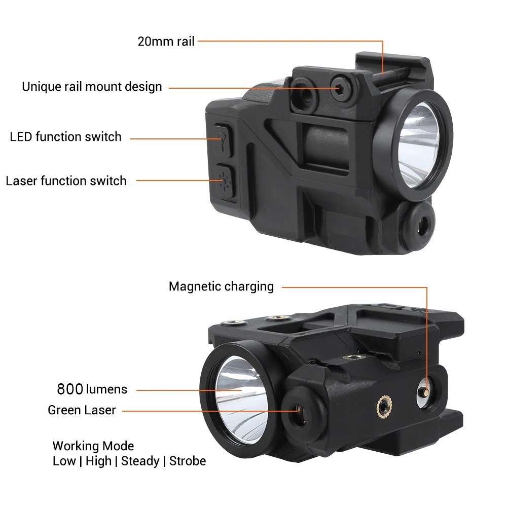 -Este artículo es una combinación compacta de mira láser verde recargable y linterna, con un brillo máximo de 800 lúmenes y una mira láser verde brillante (Clase IIIa Clase 3R, 5MW) que es mucho más visible durante el día y facilita la adquisición de objetivos en cualquier condición de iluminación.