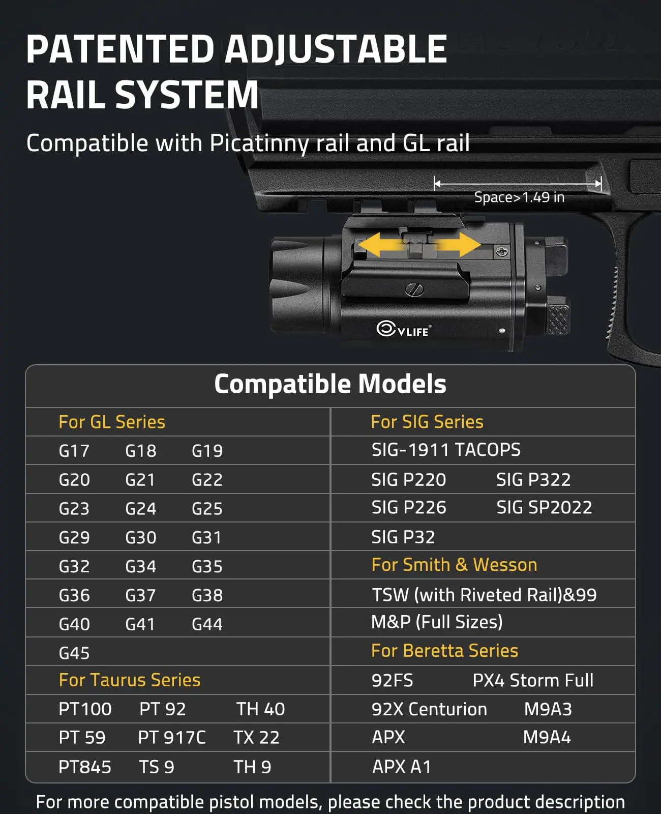 【MEJOR COMPATIBILIDAD】: La luz táctica CVLIFE para pistola tiene un mecanismo de liberación rápida y un riel ajustable (adelante y hacia atrás) para adaptarse a más tipos de rieles diferentes, por lo que su compatibilidad es mejor que otras.Es compatible con la mayoría de las series GL (excepto GL43) y los rieles Picatinny 1913 de 21 mm.El peso es de sólo 126 g, fácil de transportar sin estrés.