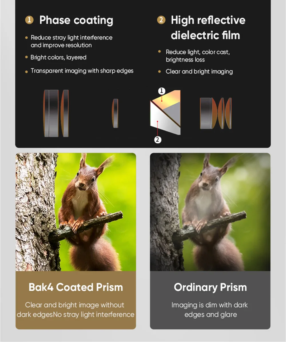 2. Óptica superior: Prisma BaK-4 en el interior y revestimiento de lente totalmente multicapa: fortalezca la función clave de un monocular, transmisión de luz y brillo superiores, haga que su vista sea más brillante, más clara y ofrezca imágenes nítidas.