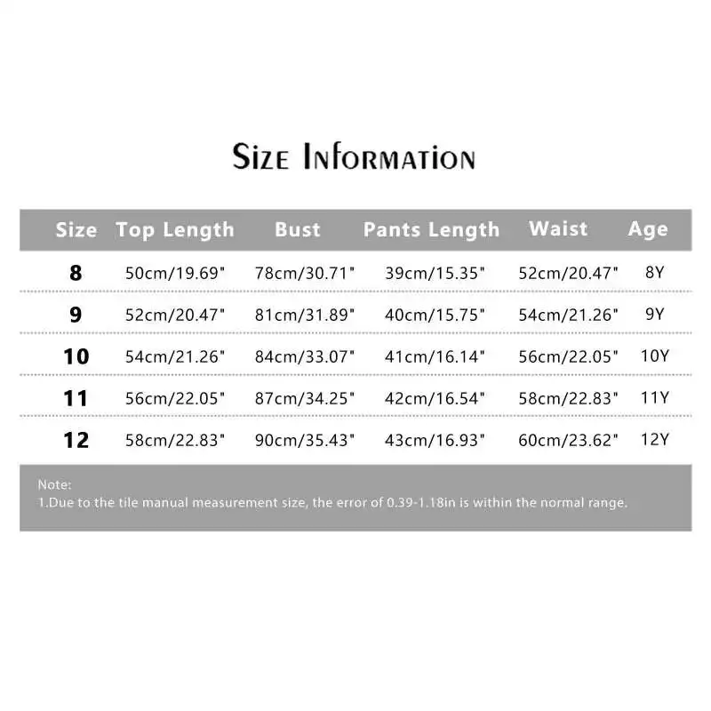 Size-----Top Length---------Bust---------Pants Length--------Waist------------Age