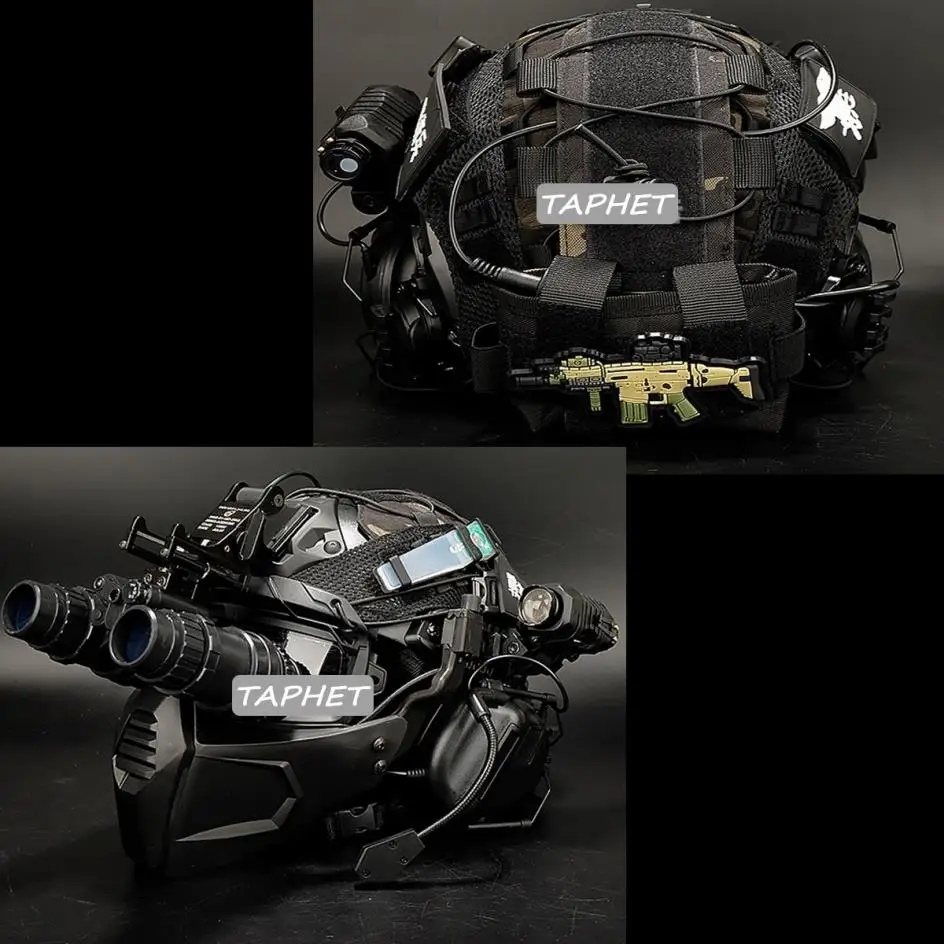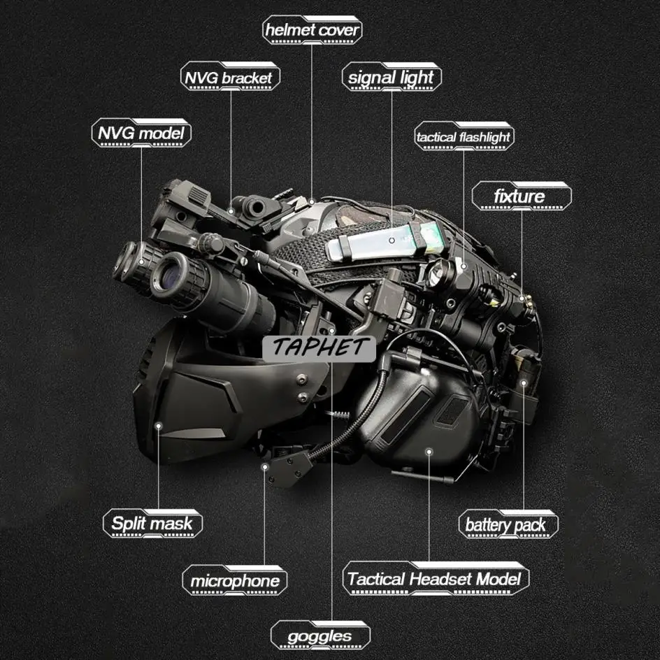 B: Casco táctico * 1 paño para casco * 1 auricular táctico * 1 linterna * 1 soporte para linterna * 1 capucha táctica * 1 modelo NVG * 1 soporte NVG * 1 gafas * 1